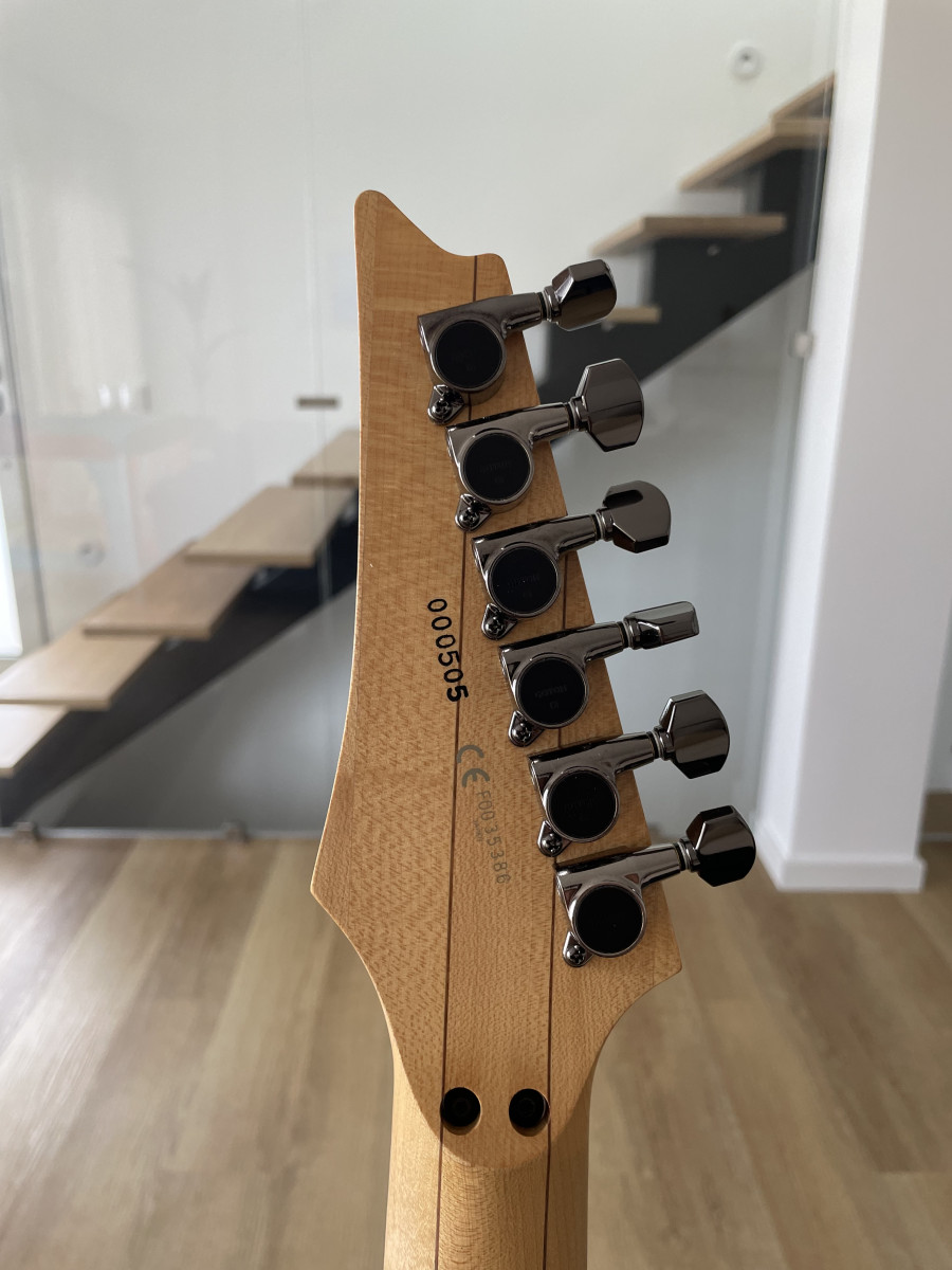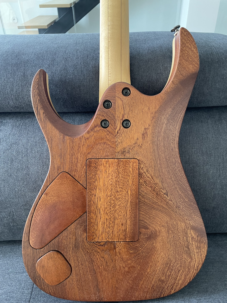 Cuerpo de caoba de dos piezas CNC con tapa de arce de 14 mm. Color Purple Doom, acabado en aceite para armas y cera de abeja. El mástil es una Ibanez RG1880 J Custom OEM. Mástil NOS, nuevo (Serie - F0035386). Diapasón de palisandro de 24 trastes con ribete y marcadores de posición de puntos descentrados. Controles de volumen y tono empotrados. Selector de 3 posiciones. Las tapas traseras también son de caoba y están montadas con pequeños imanes. Incluye un par de pastillas Suhr Aldrich color Zebra. Todos los herrajes son NUEVOS en Cosmo Black.