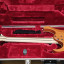 Con maleta, papeles, herramientas de ajuste y su palanca tremolo.