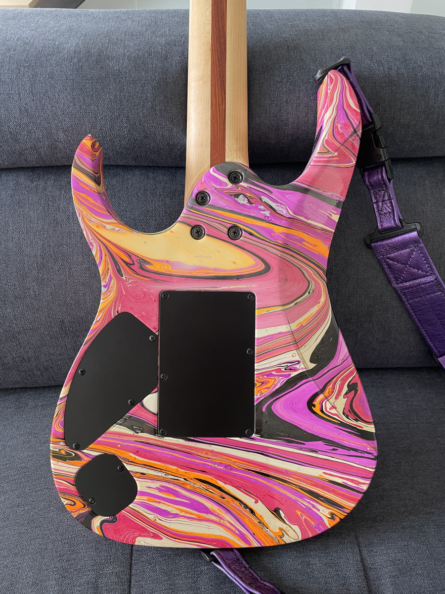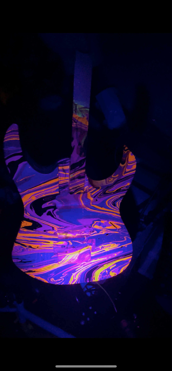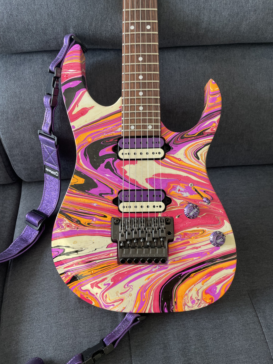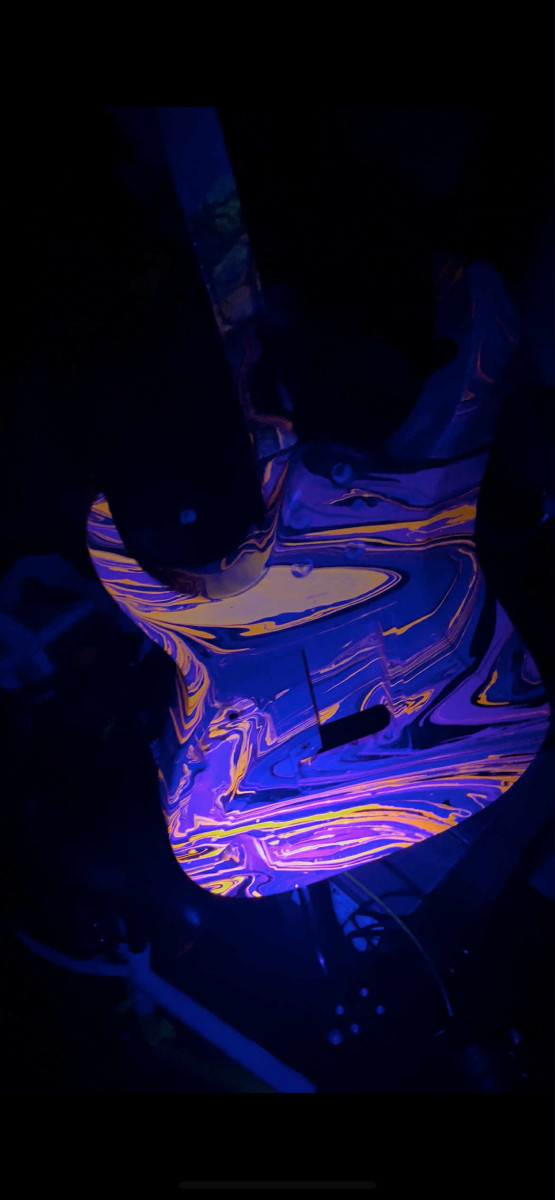 Custom Swirl ( Black, Ruby Red, Gold, Passion Purple & Neon Orange), i called this color combo "Valhalla". Viking style for a 7 string monster. And yes, it glows in the presence of UV light!!!!