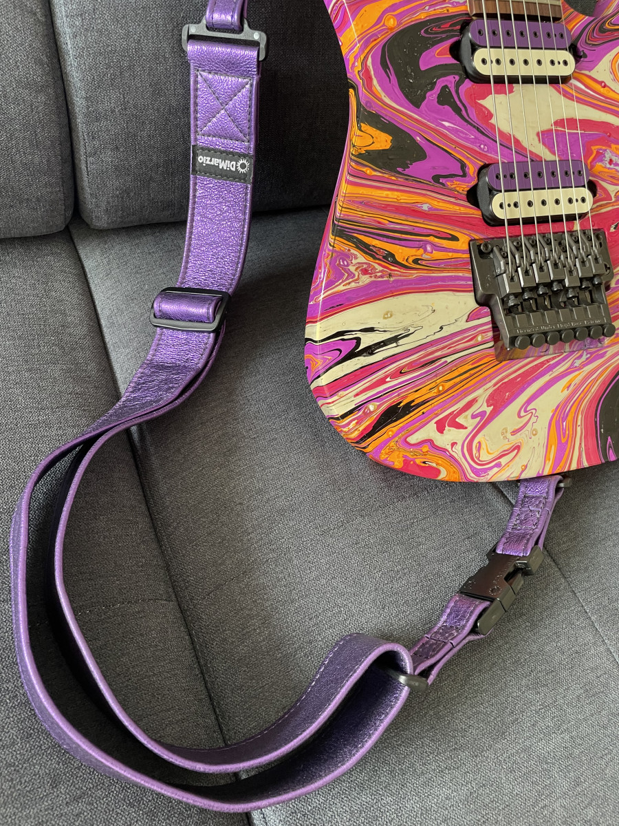 Estuche rígido Ibanez Prestige OEM (interior rojo) y palanca de vibrato. Incluye una correa de cuero morada personalizada (Dimarzio). Selector de posición de 5 posiciones. Perillas Swirl personalizadas en MC morado.