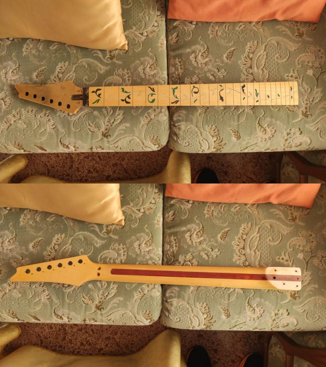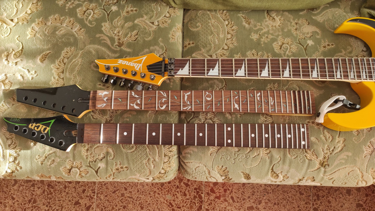- y el tercero de una Ibanez RG550 Japón con cambio diapasón en arce con el inlay del tree of life en verde y negro chulísimo.