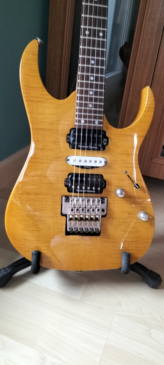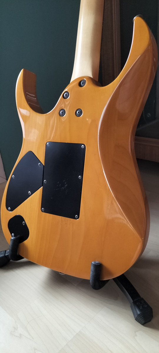 Hola a todos. En ésta ocasión saco una ibanez rg 570 japonesa muy especial y mejorada. Digo lo de especial porque en contra de la mayoría de ibanez rg que habitualmente son de tilo o caoba, ésta es de aliso con tapa de arce flameada. Sólo alguna jem y alguna usrg eran de ésta misma madera.