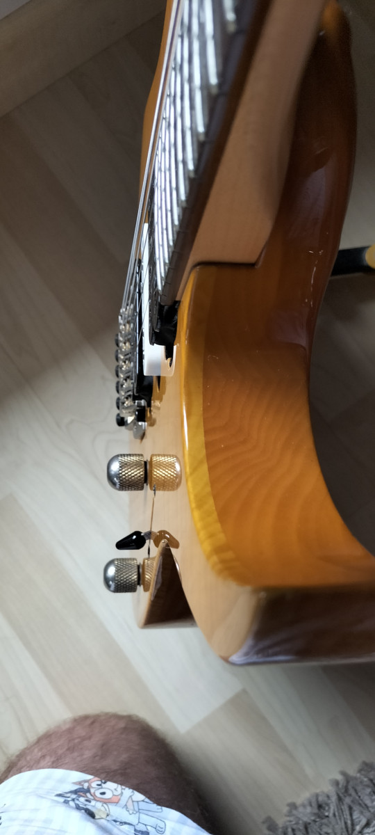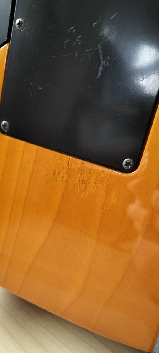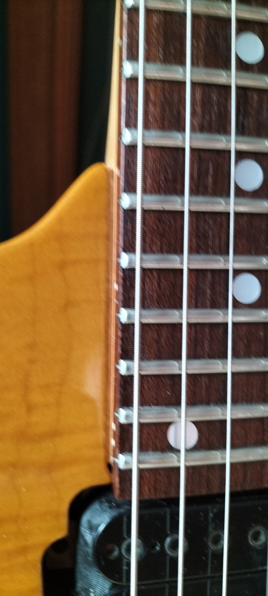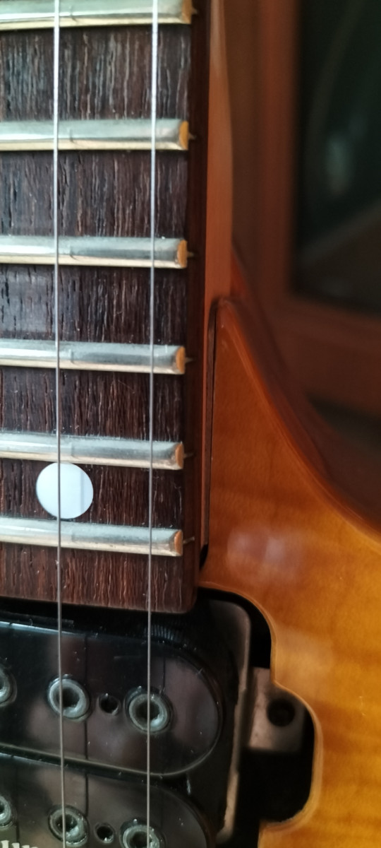 El mástil está calzado lateralmente con laminas de madera ya que por algún motivo sobraba espacio. Ahora está totalmente estable y con la alineación de cuerdas perfecta. Y tiene unas marcas de cinturón detras y la mítica rajita(estable del todo) detrás de la cejilla. Todo fotografiado.