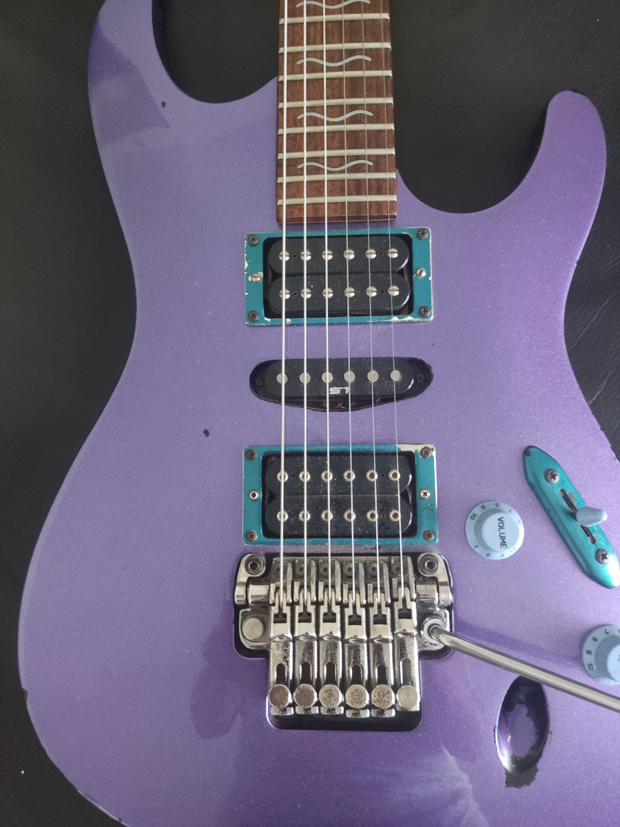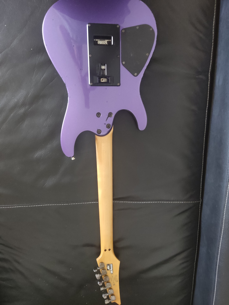 Lo malo: guitarra con unos cuantos años, con marcas de uso, trastes no están al 100% (ver fotos), el puente flotante tampoco está del todo correcto.