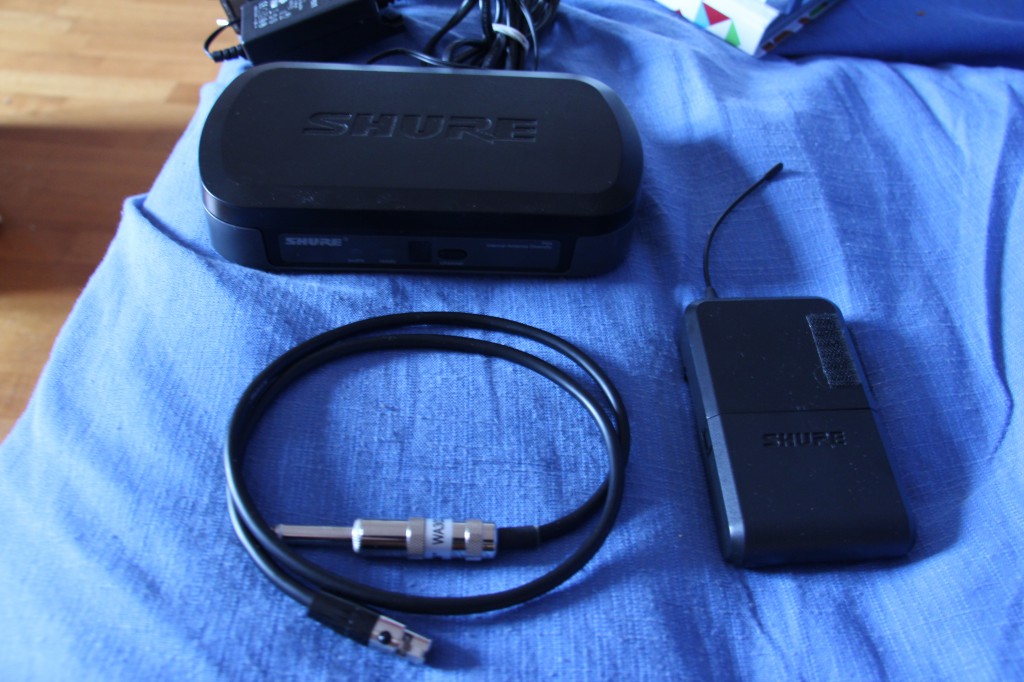 Incluye el receptor, la petaca, el cable para inchufar el instrumento y el cable de corriente del receptor. No conservo la caja ni el manual pero es muy intuitivo y extremadamente facil de usar! De todas formas se puede descargar el manual en la pagina de Shure.