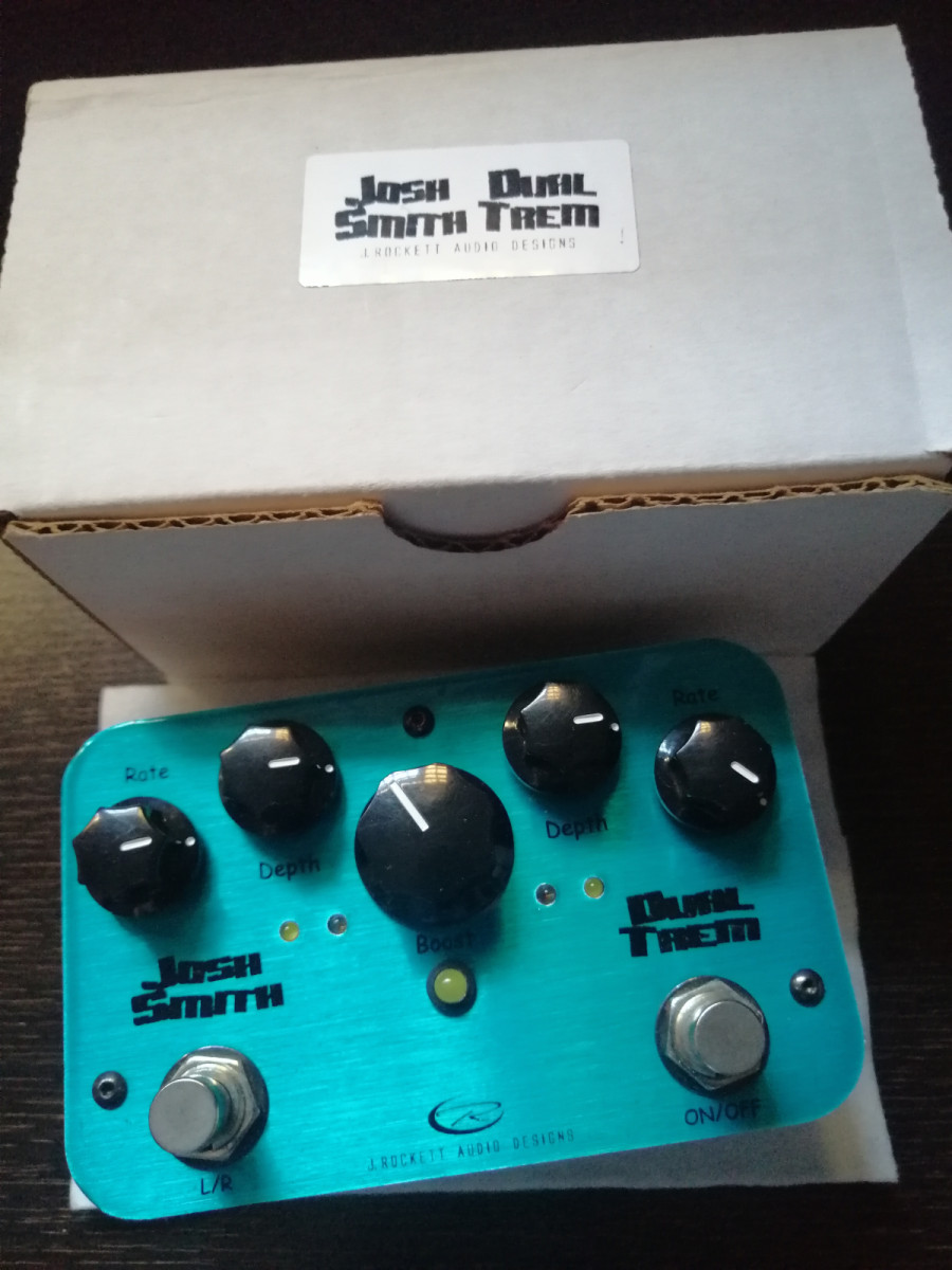 Josh Smith Dual Tremolo de J. Rockett audio. Transparente y precioso tremolo con dos configuraciones a elegir, el booster es muy practico. Con su caja y sin un rasguño. Calidad brutal.