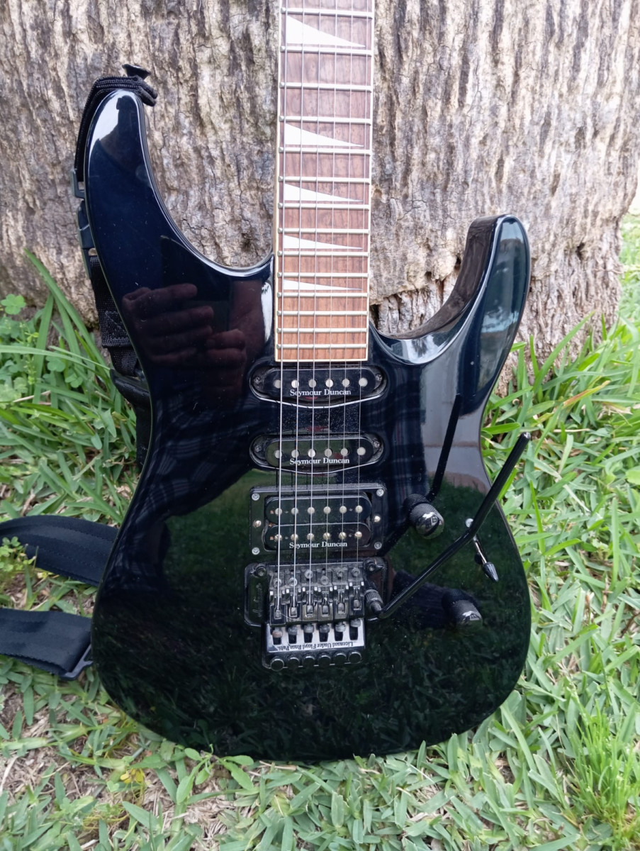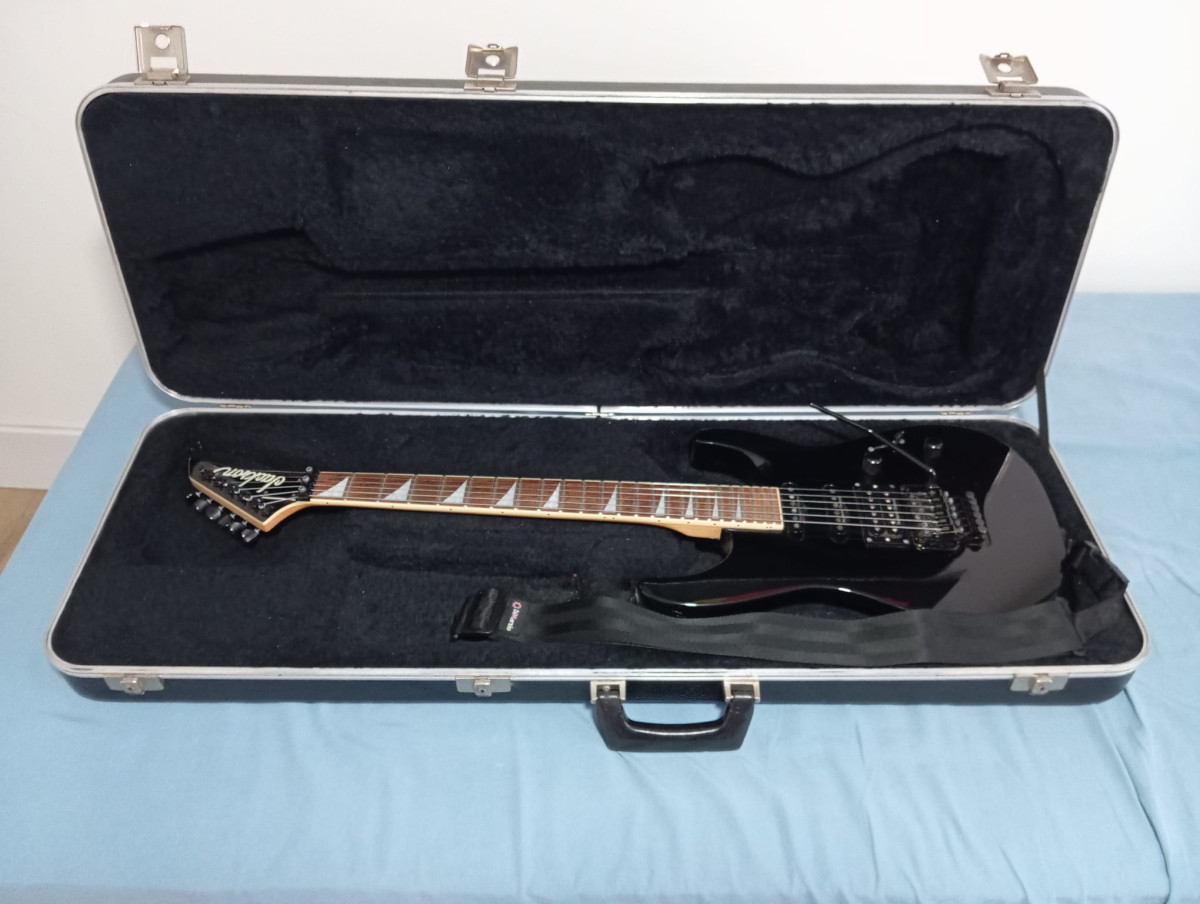 Guitarra Jackson DK2 dinky japonesa de 1998 pastillas seymour Duncan JB SH4 en el puente y stk1 en medio y mástil, las stk1 son humbuckers en formato simple. Puente Floyd Rose licence superestable cuerpo de aliso y mástil de arce tiene algunas marcas, regalo Correa di marcio cliplock ajustada con cuerdas 010