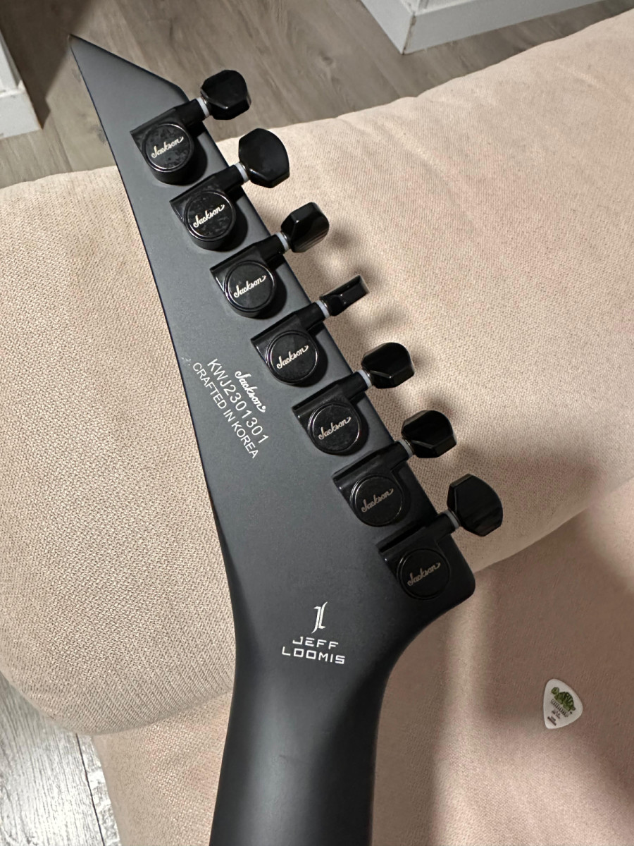NO INTERCAMBIO! Guitarra eléctrica de siete cuerdas Jackson Pro Series Signature Jeff Loomis Soloist SL7. En acabado Satin Black. Cuerpo de tilo con tapa de fresno arenado. Mástil "neck-through de 3 piezas de arce reforzado con grafito. Dipason de ébano de radio compuesto (12"-16") Cejilla Floyd Rose 1500 Series de 47.6 mm. Pastillas activas Seymour Duncan Jeff Loomis Signature Blackouts. Control de volumen. Selector de 3 posiciones. Herrajes en negro. Puente Floyd Rose 1500 Series Double Locking.