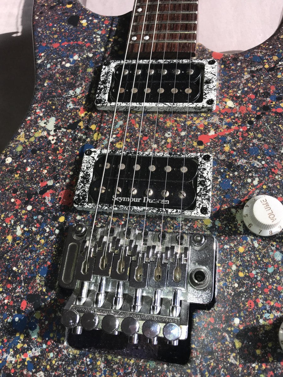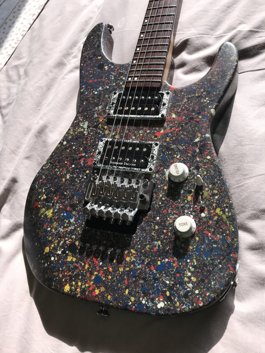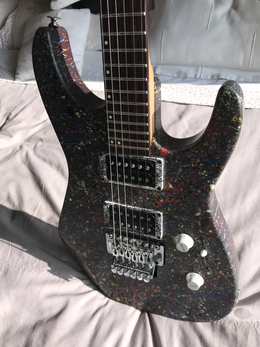 Jackson Dinky JS32 de principios de los 2000. Acabado hecho a mano con salpicaduras multicolor, totalmente nivelado para un tacto y apariencia uniforme, barnizado en acrílico mate.