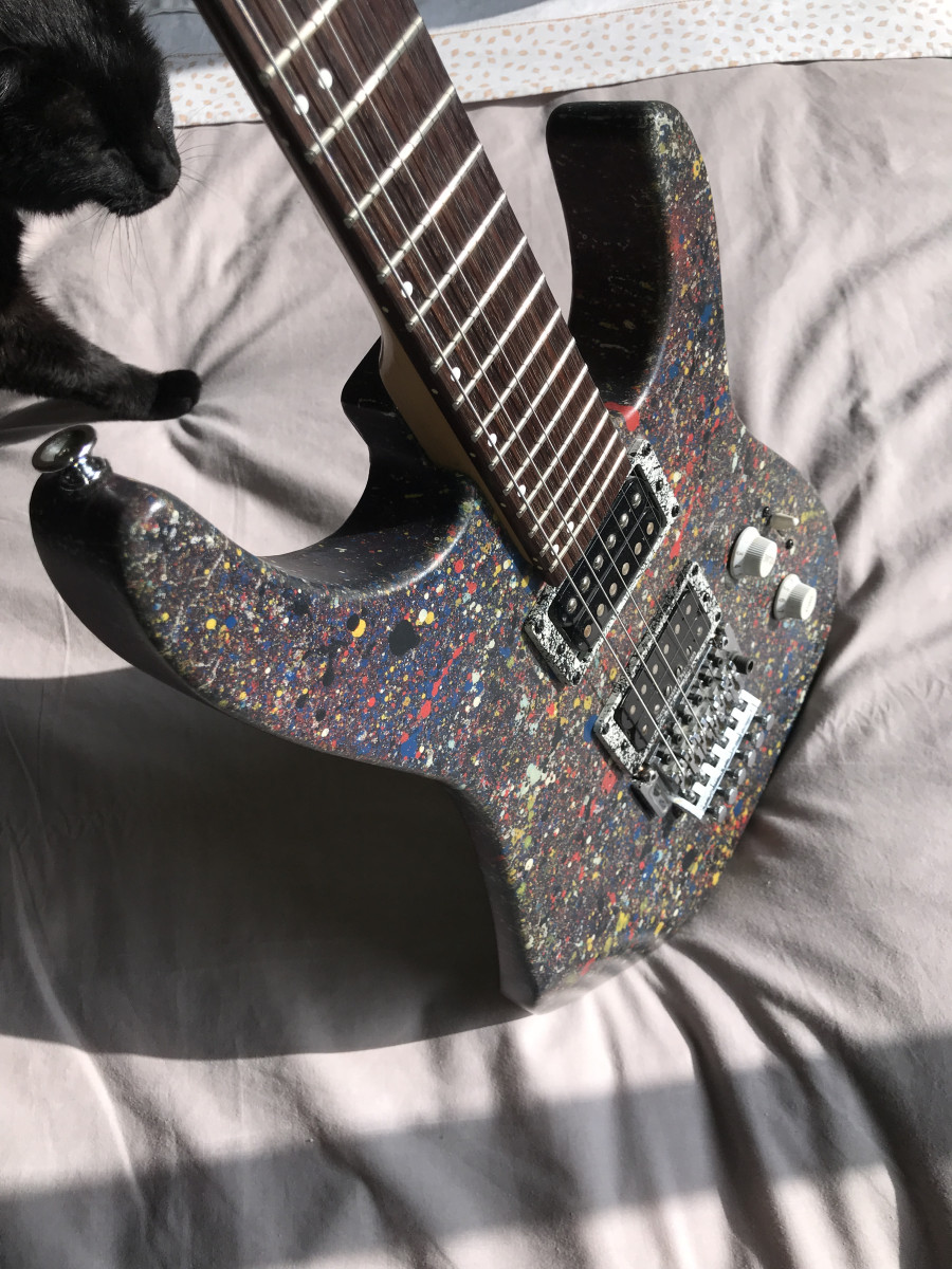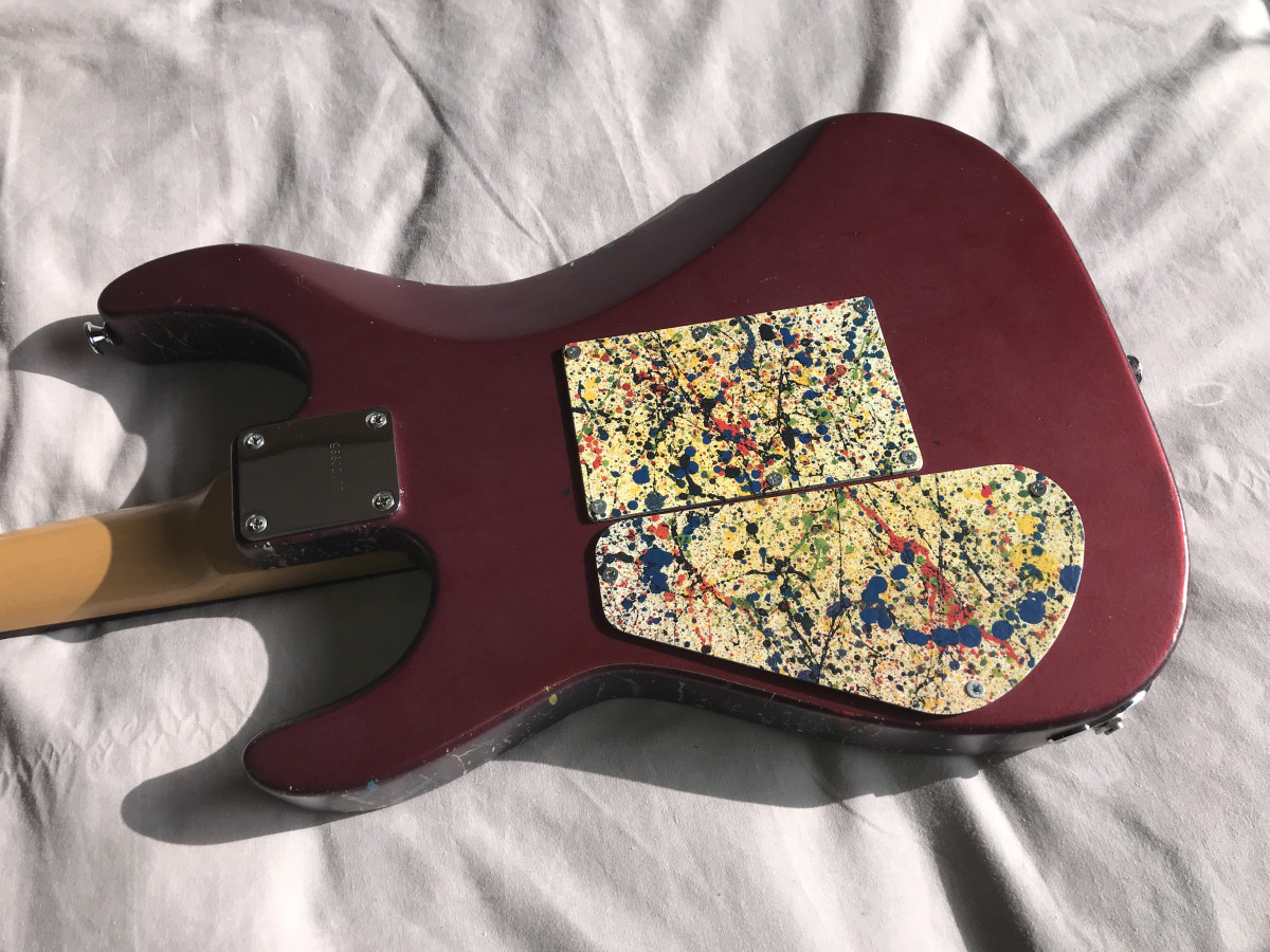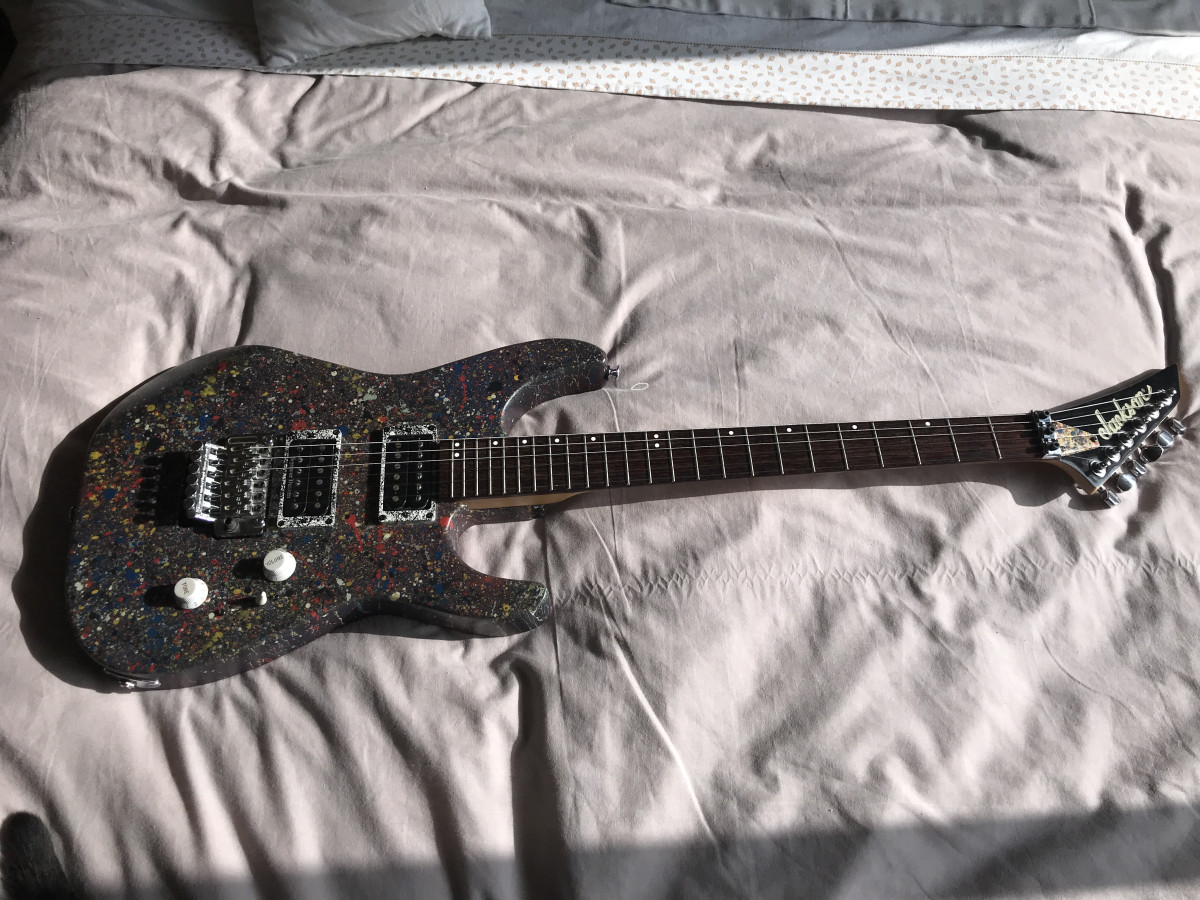 Jackson Dinky JS32 de principios de los 2000. Acabado hecho a mano con salpicaduras multicolor, totalmente nivelado para un tacto y apariencia uniforme, barnizado en acrílico mate.