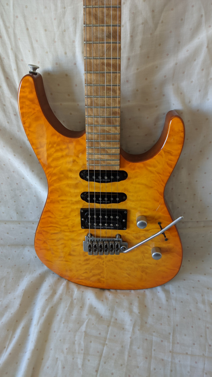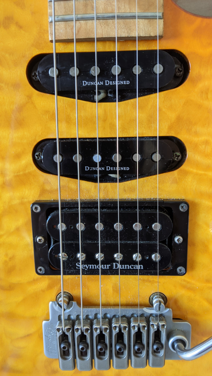 esta magnífica superstrat,es de 1997,en muy buen estado,los trastes están enteros, lleva dos pastillas Seymor Duncan ssl1,y la famosa JB,llevaba de serie Duncan Designed.