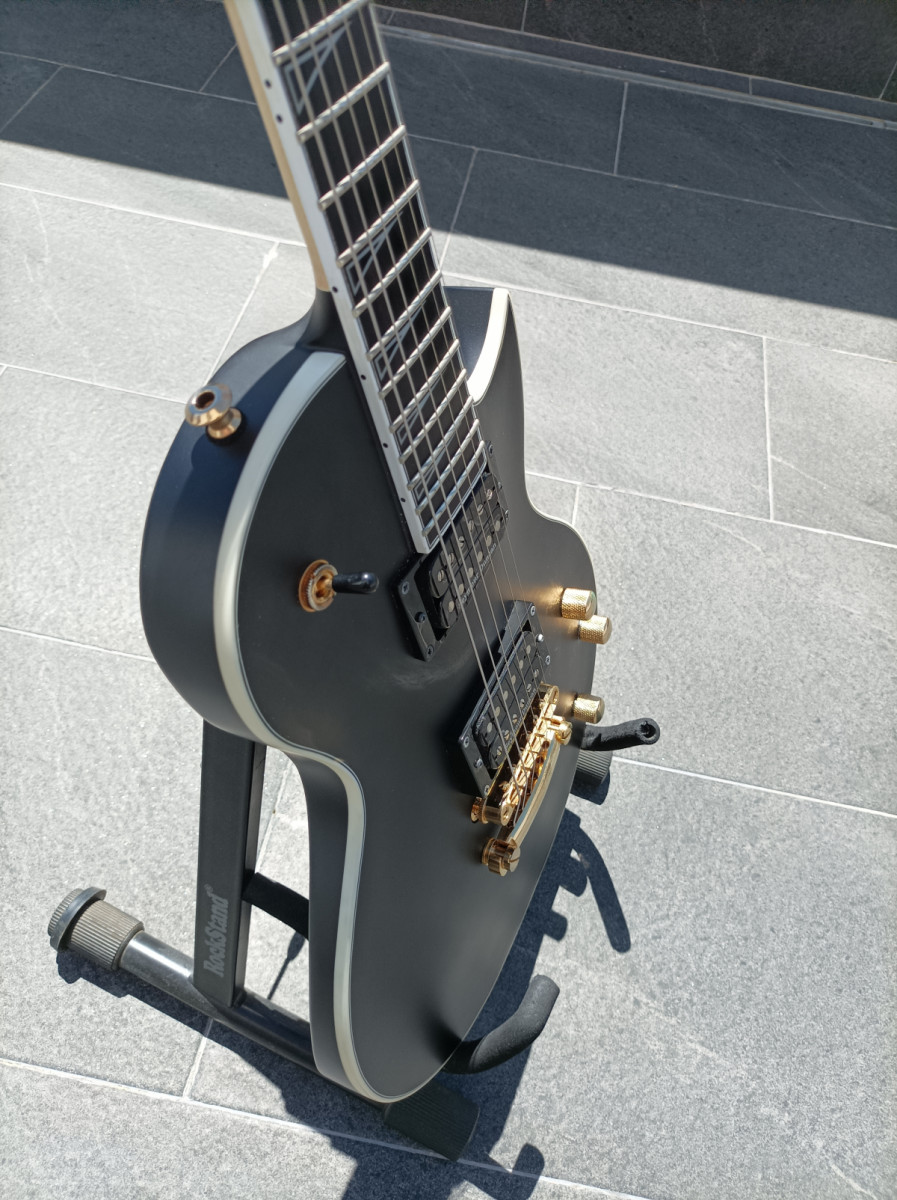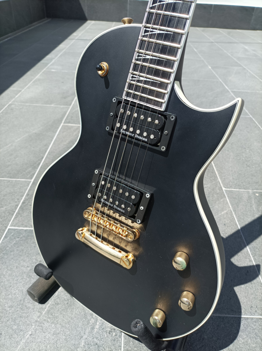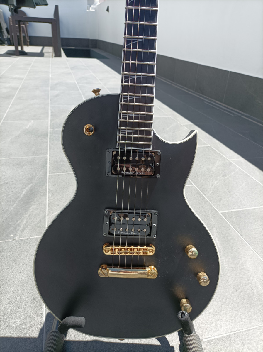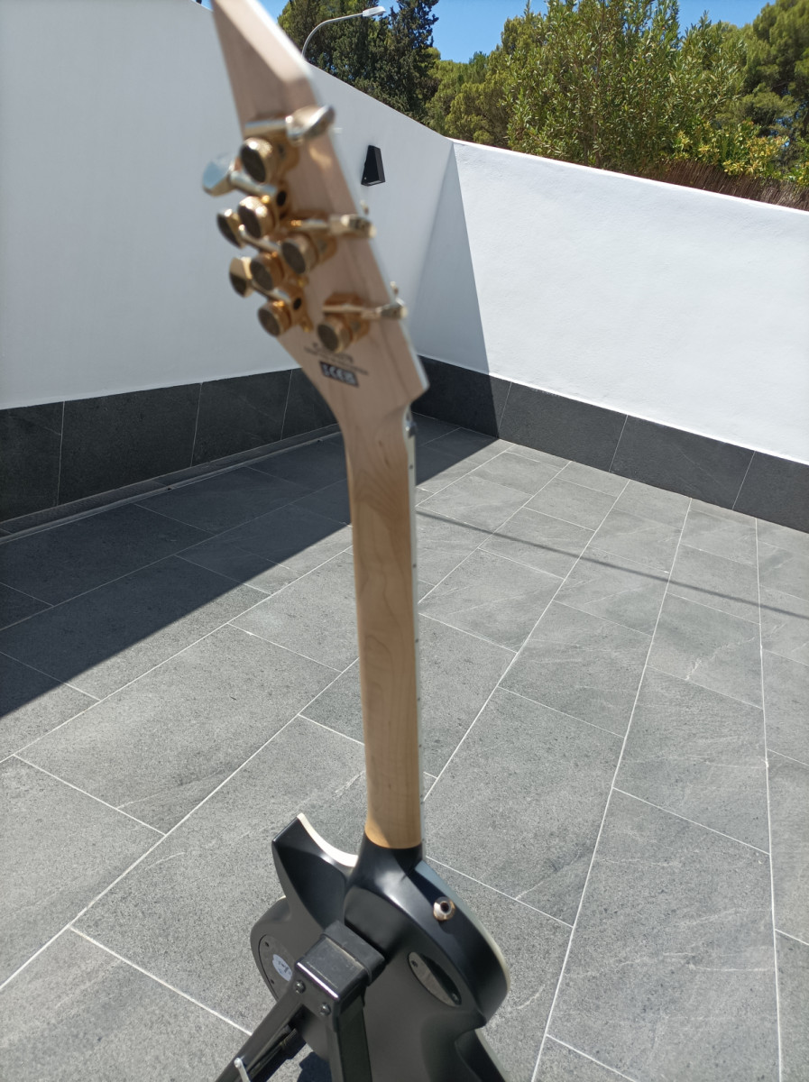 Esta Jackson es muy similar a las ESP Eclipse o LTD EC-1000, es decir, una Les Paul aerodinámica. Ligera y mas enfocada al metal, aunque superversatil con sus pastillones seymour duncan.
