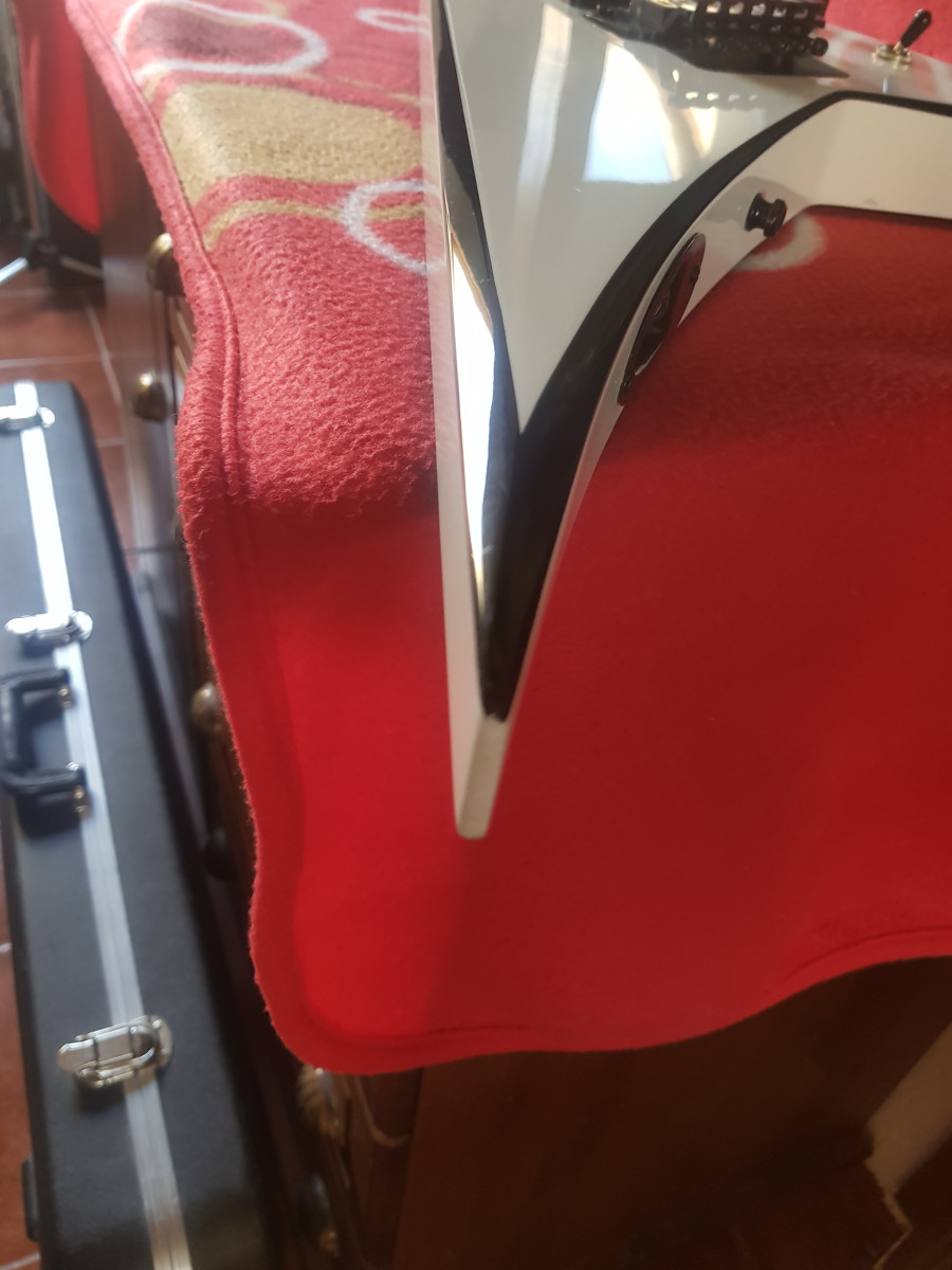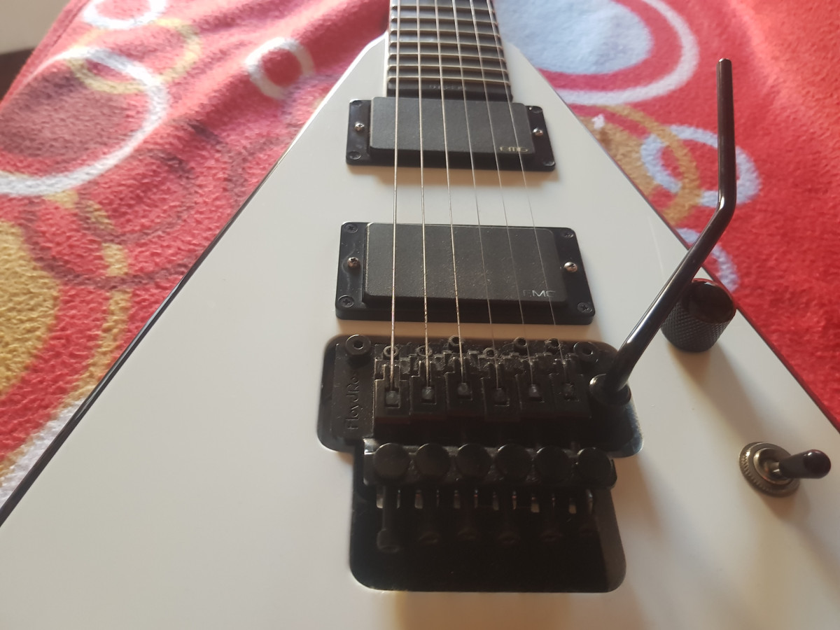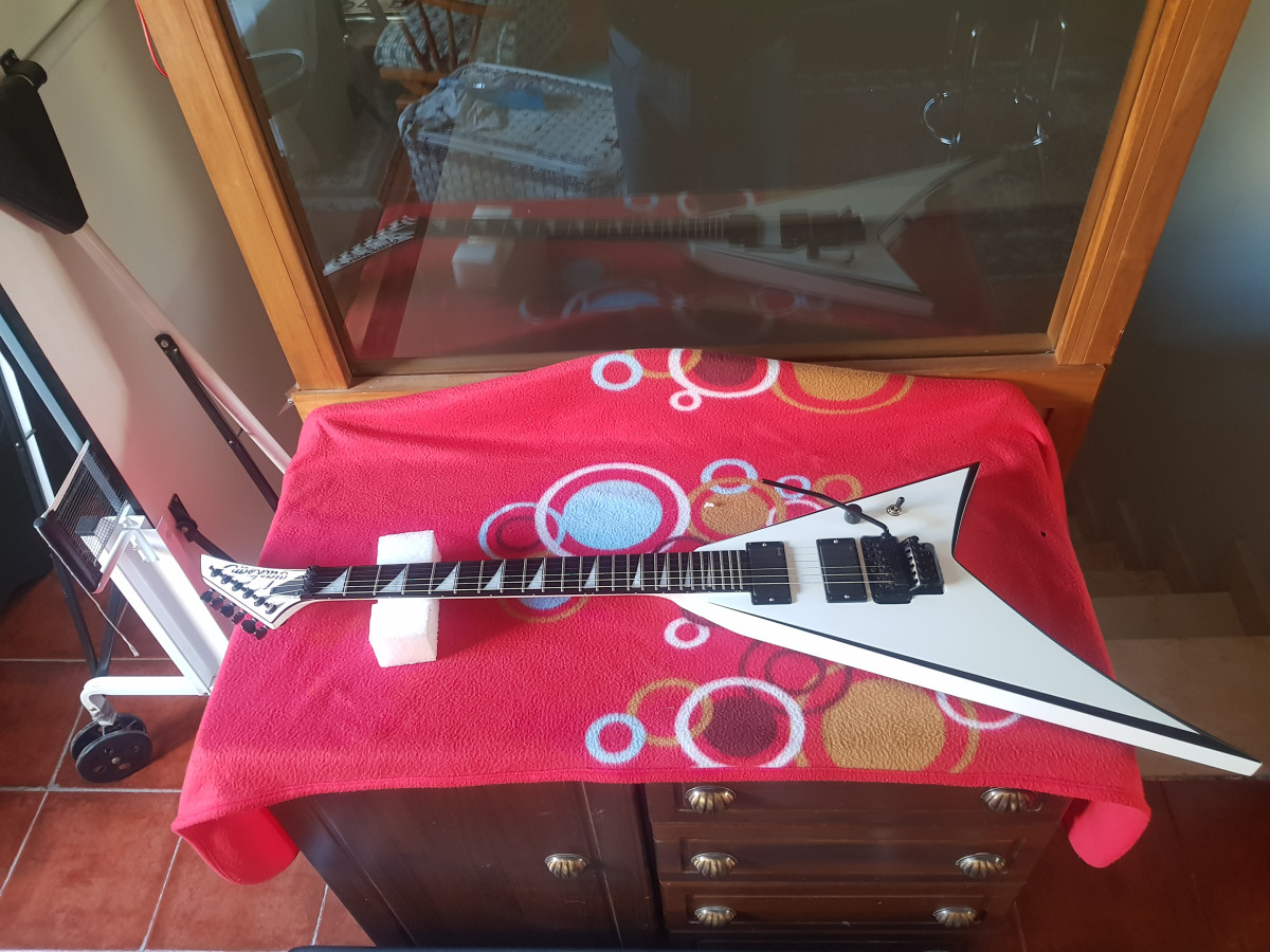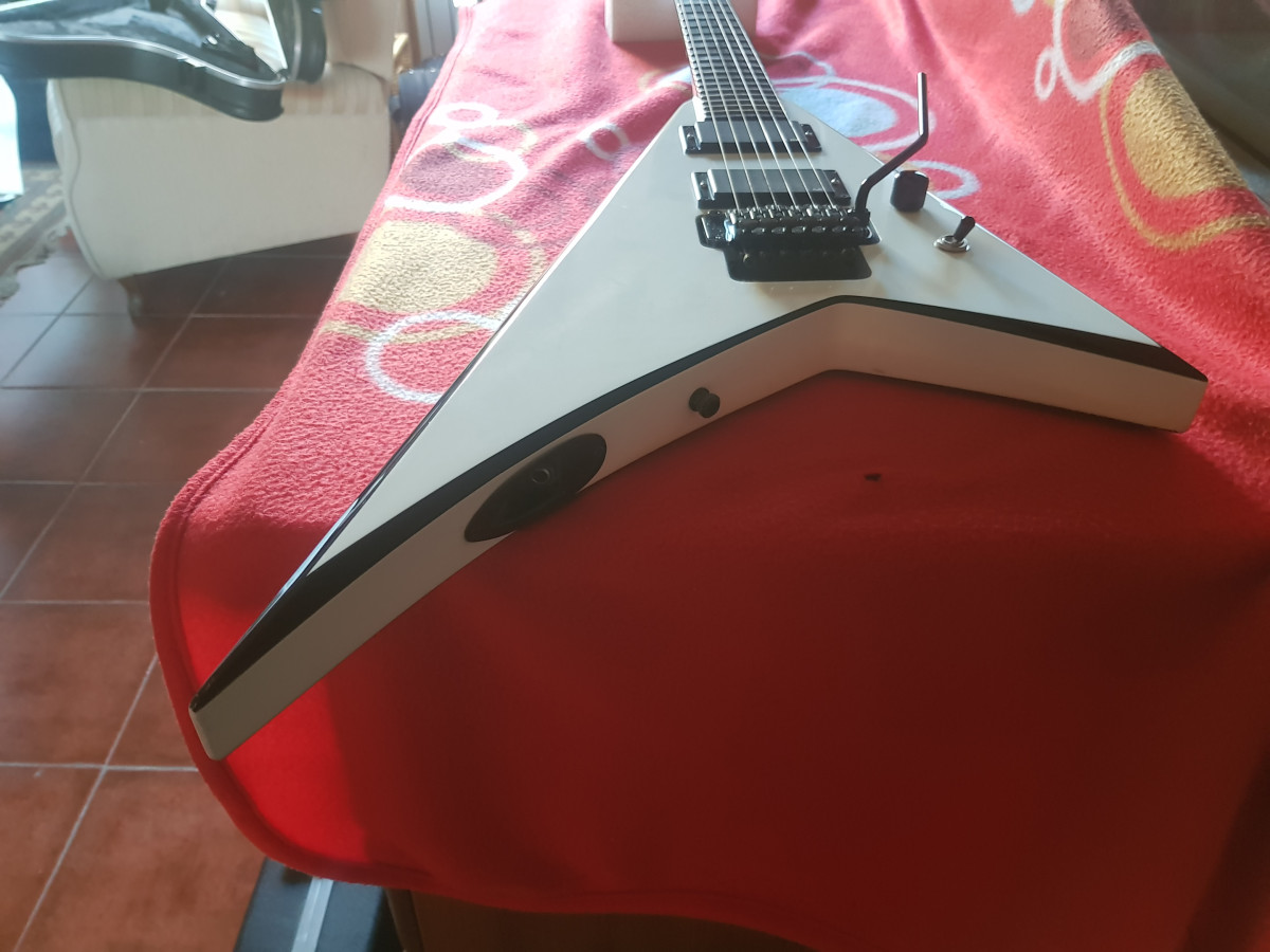 Vendo este bicharraco de guitarra Randy Rhoads, en perfecto estado. Es la RR24 japonesa, la buena que venía con una sola pastilla, y un gran luthier le añadió la pastilla del mástil, en un trabajo impecable y la convierte en casi única. Diapasón de Ebano del de antes, fantástico que le da un tono a la guitarra espectacular.
