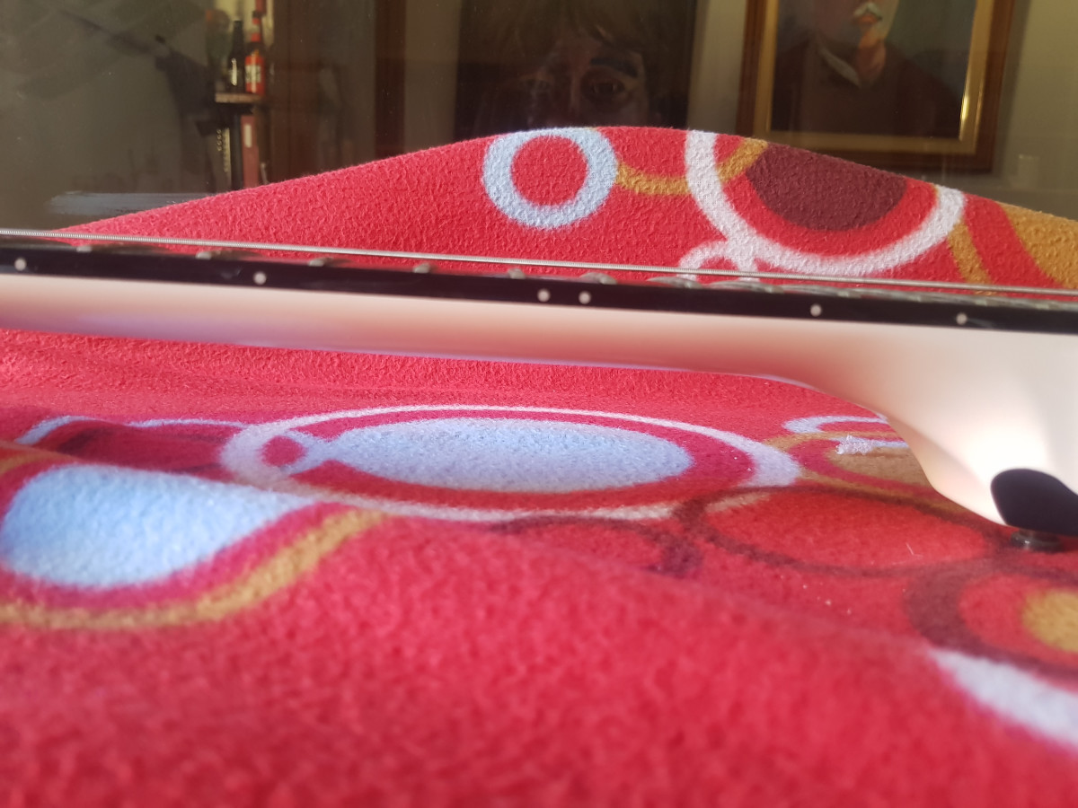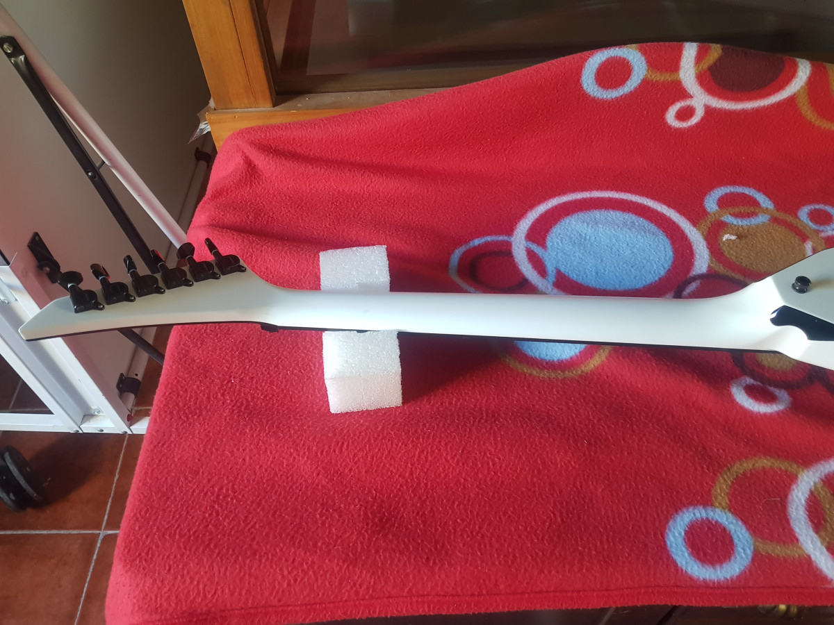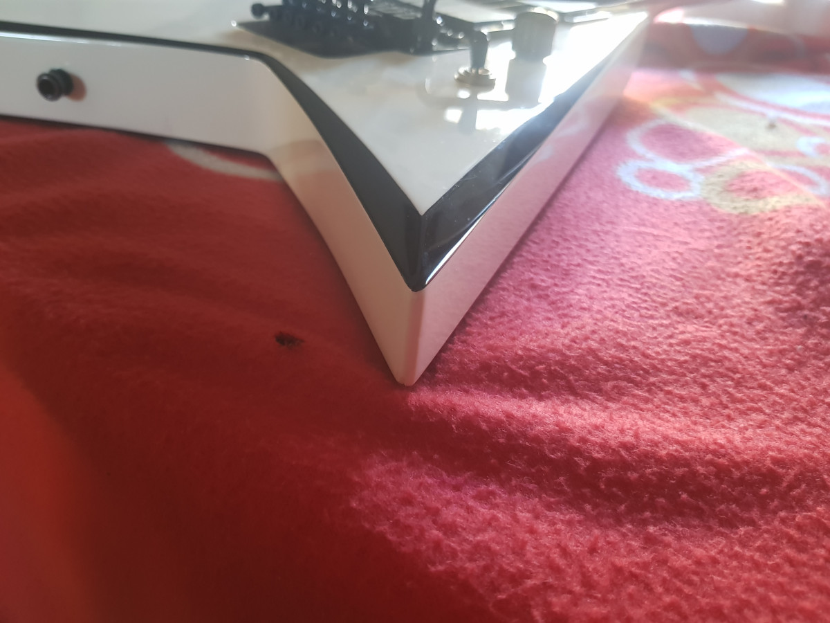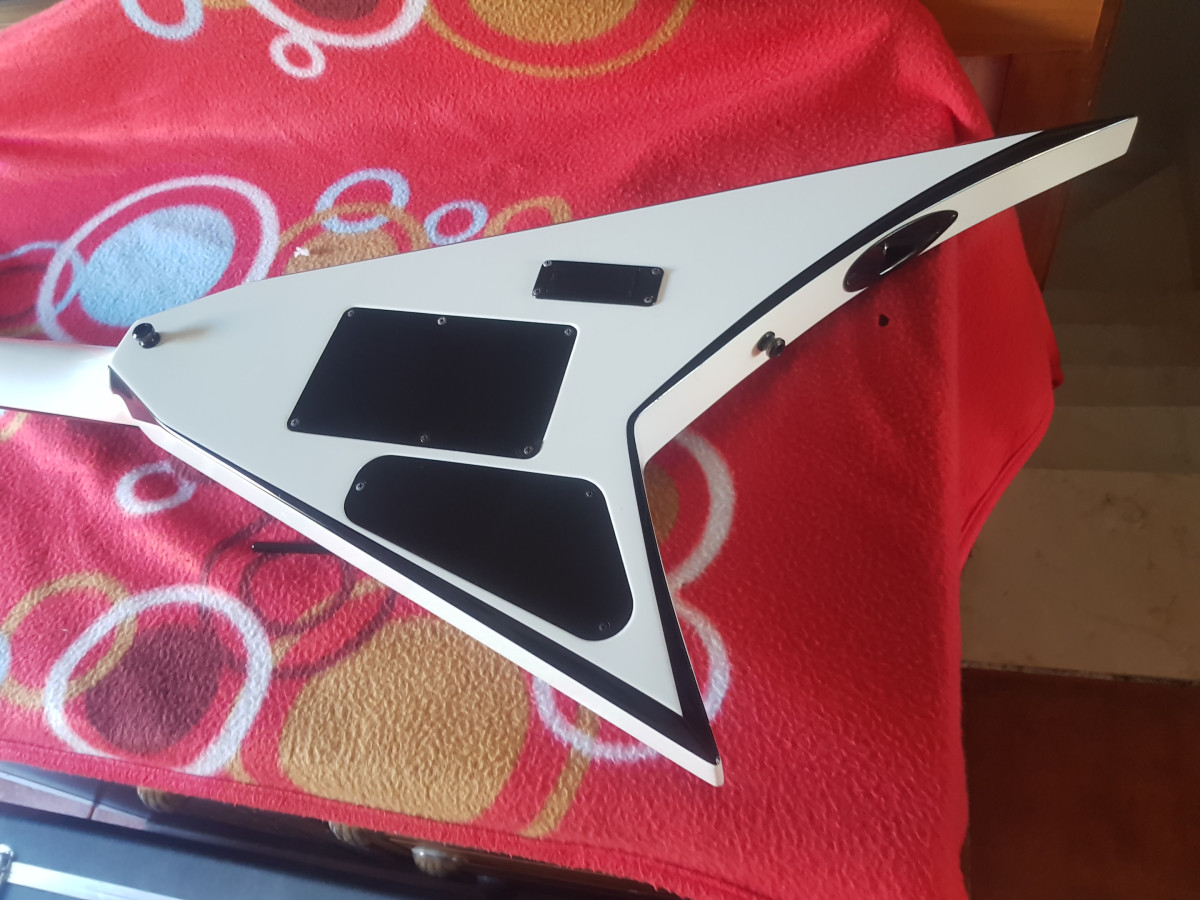 Vendo este bicharraco de guitarra Randy Rhoads, en perfecto estado. Es la RR24 japonesa, la buena que venía con una sola pastilla, y un gran luthier le añadió la pastilla del mástil, en un trabajo impecable y la convierte en casi única. Diapasón de Ebano del de antes, fantástico que le da un tono a la guitarra espectacular.