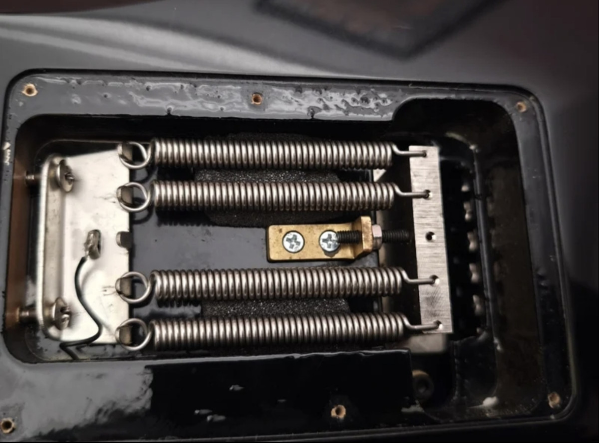 La guitarra lleva de base floyd rose pero se le colocó (hecho por luthier) la pieza que viene en las imágenes del anuncio para bloquearlo. Si quieres usarla con Floyd es tan fácil como desatornillar la pieza y ya (y viceversa).