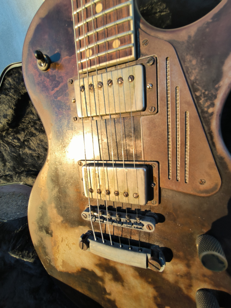 Es una guitarra espectacular, tanto en el look, el tacto y el sonido, suena a les paul buena con un toque de telecaster. El mástil es de caoba y el diapason de palorosa. Estuche Gator deluxe a prueba de bombas incluido.