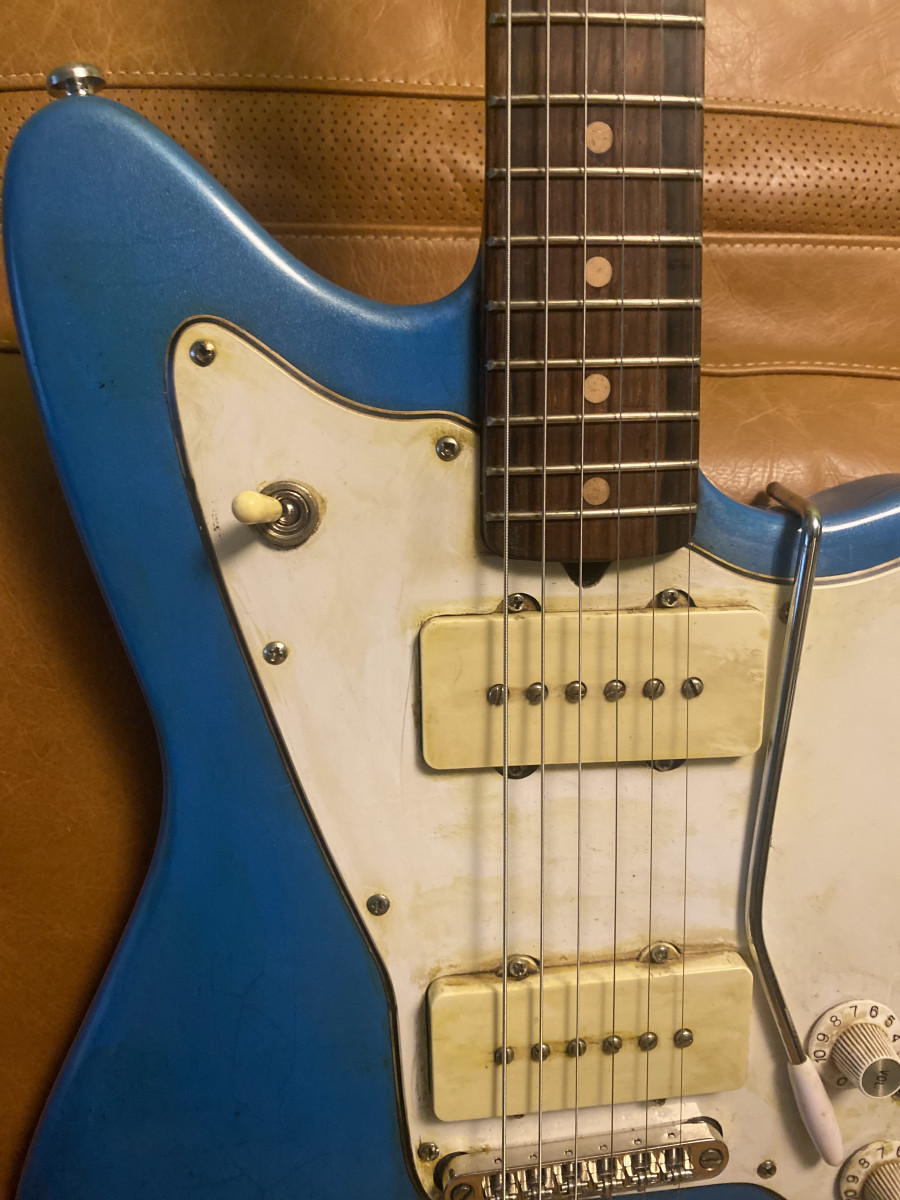 -Tremolo Fender, electrónica CTS, se ha prescindido del circuito típico de Jazzmaster, optando por volumen, tono y selector. Pastillas Jmascis, que son valoradas en el mercado pero deberían estarlo más. P90 en formato Jazzmaster. Supero dulces, definidas y con cuerpo en limpio y con la mala leche de las p90 sin perder definición. Puente tune o matic roller que incrementa aun más el sustain.