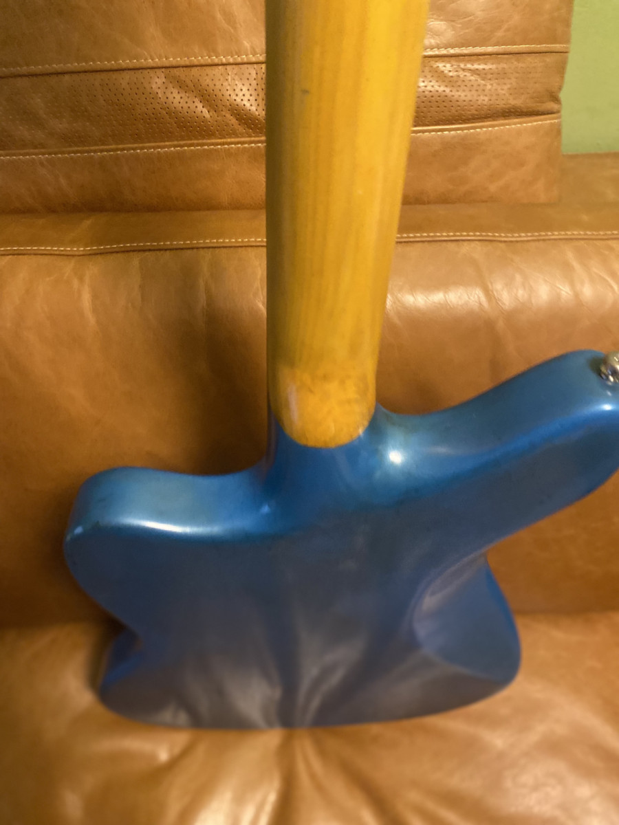 Arce canadiense y diapasón de palosanto de rio de Madagascar, el que conozca esta madera sabe de su calidad. El diapasón es tipo veneer, de 3 mm, o sea encolado curvo al arce. Radio 7,25 y trastes Jescar medium Higher. Estos trastes tienen 1,40 mm de altura y solucionan el problema de bendings de estos radios. Como se observa en las fotos, el mástil está encolado. Aparte de volverse mucho mas cómoda y ergonómica para llegar a las notas agudas se nota el sustain incrementado. Pala también lacada en azul lake placid.