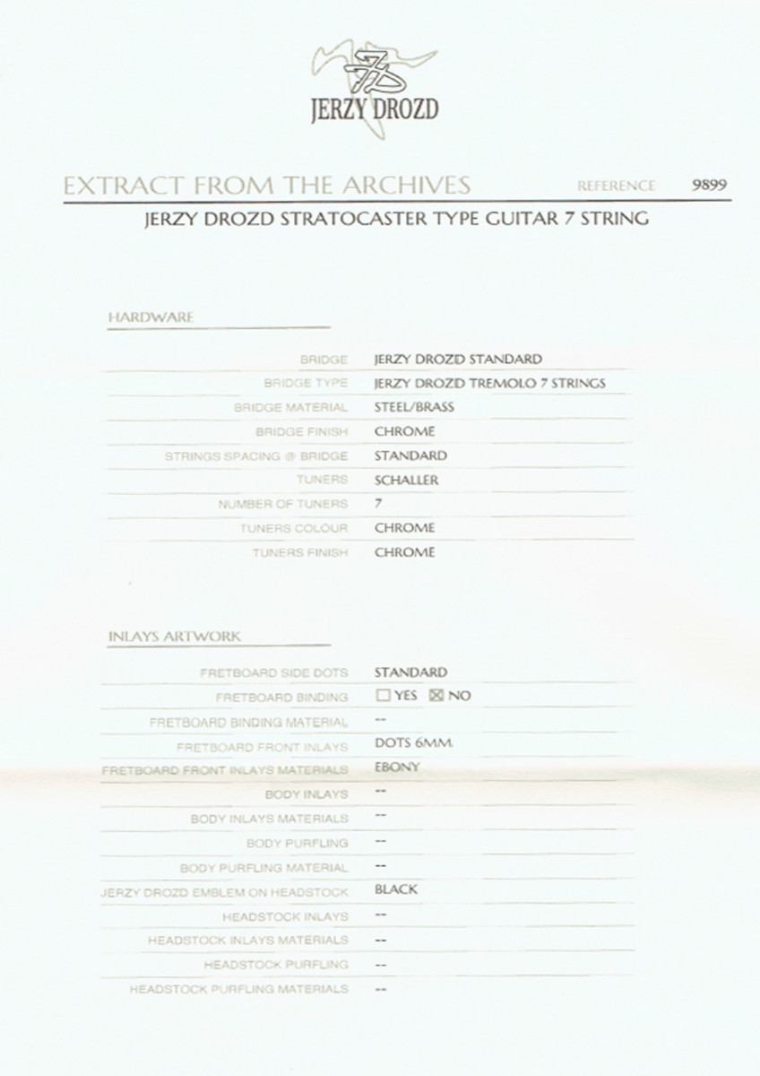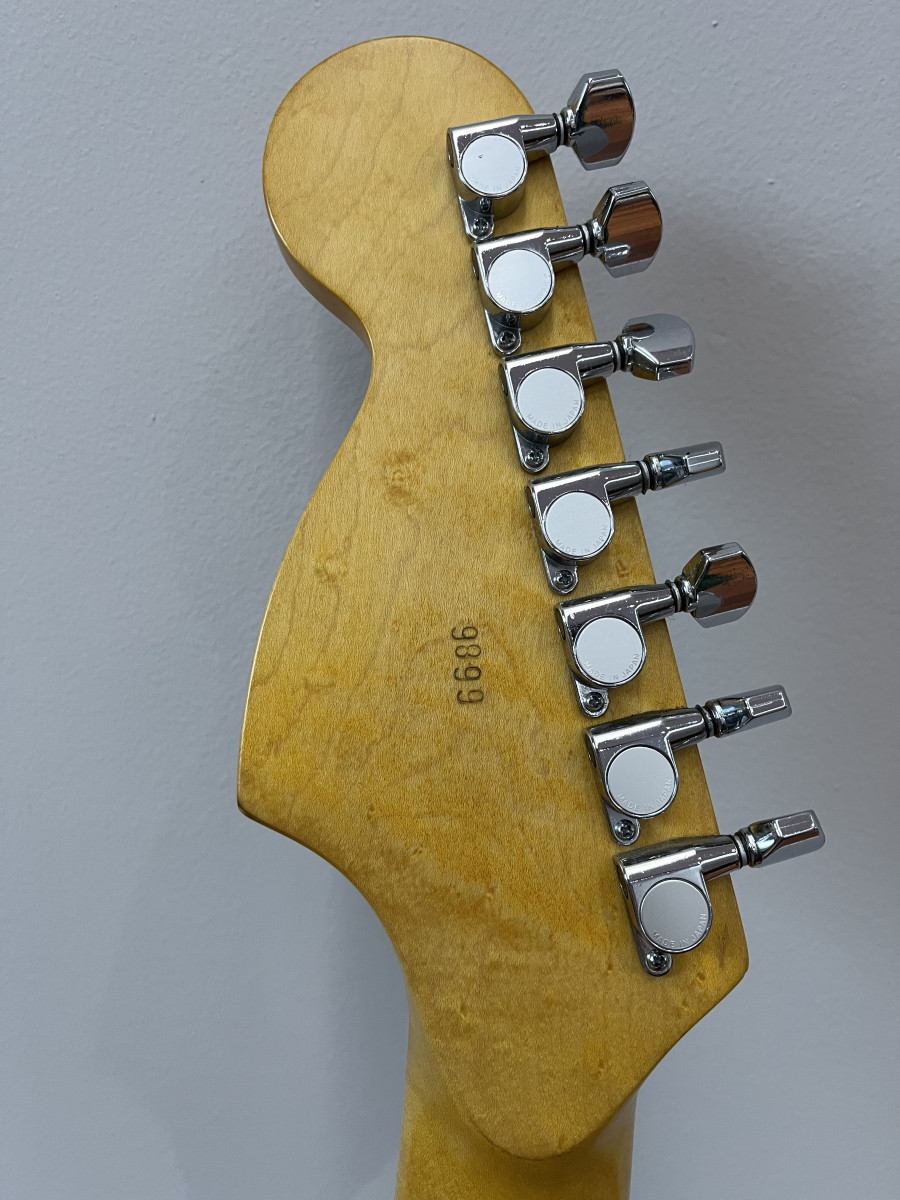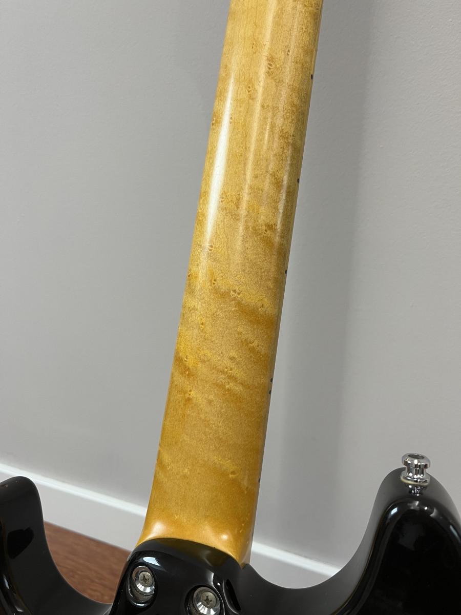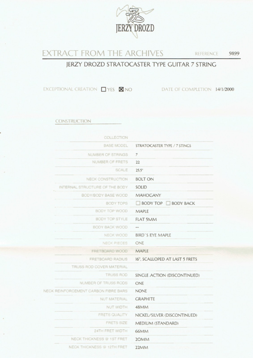 Cuerpo de caoba, tapa de arce, mástil de arce ojo de pájaro. 5 últimos trastes escalopados.