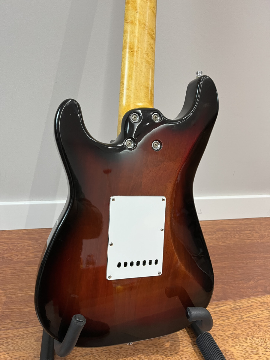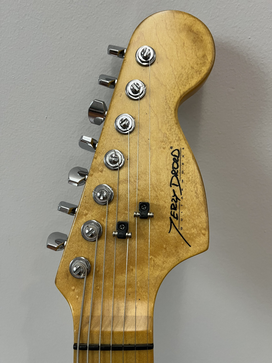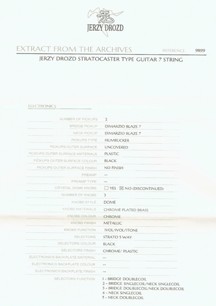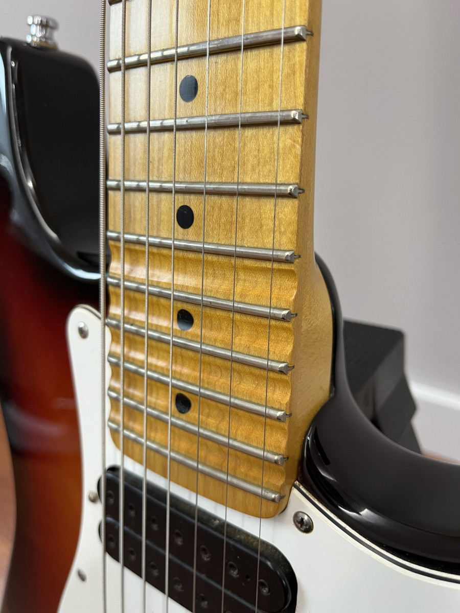 Cuerpo de caoba, tapa de arce, mástil de arce ojo de pájaro. 5 últimos trastes escalopados.