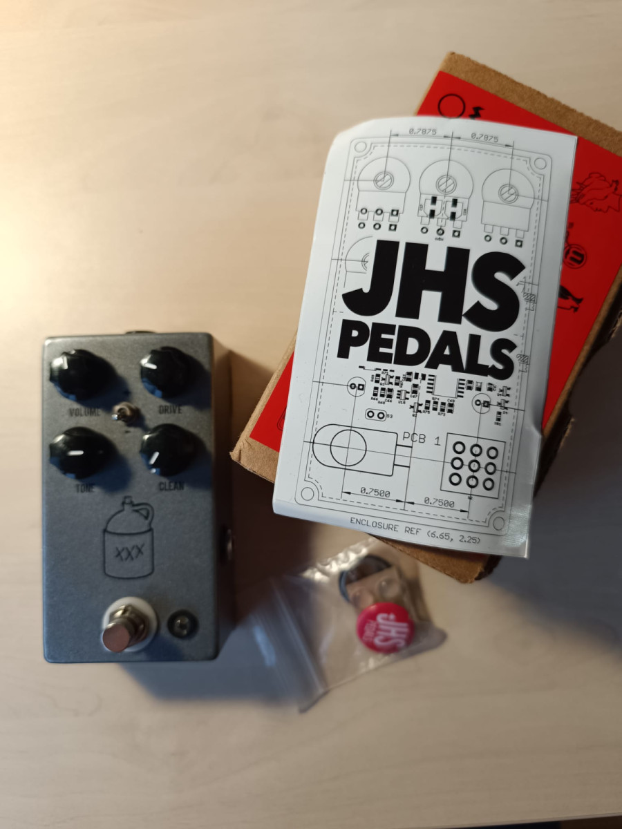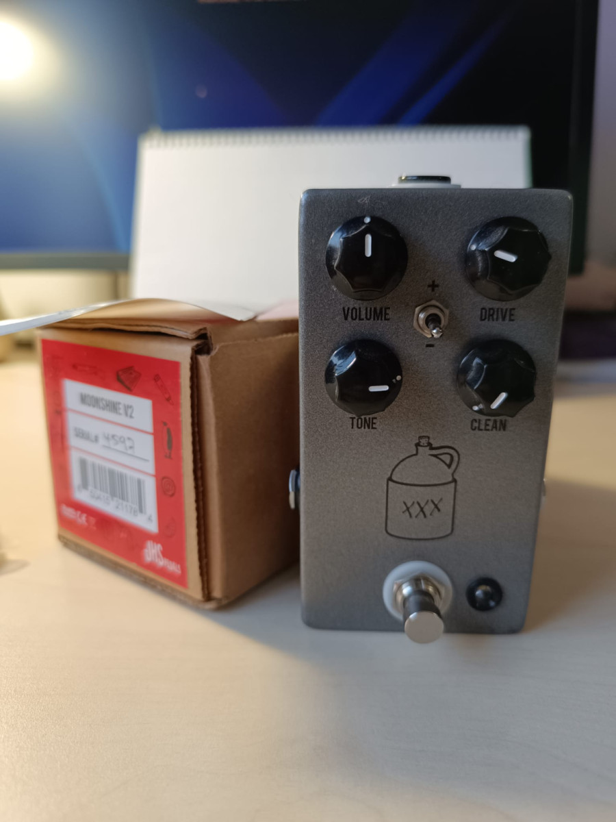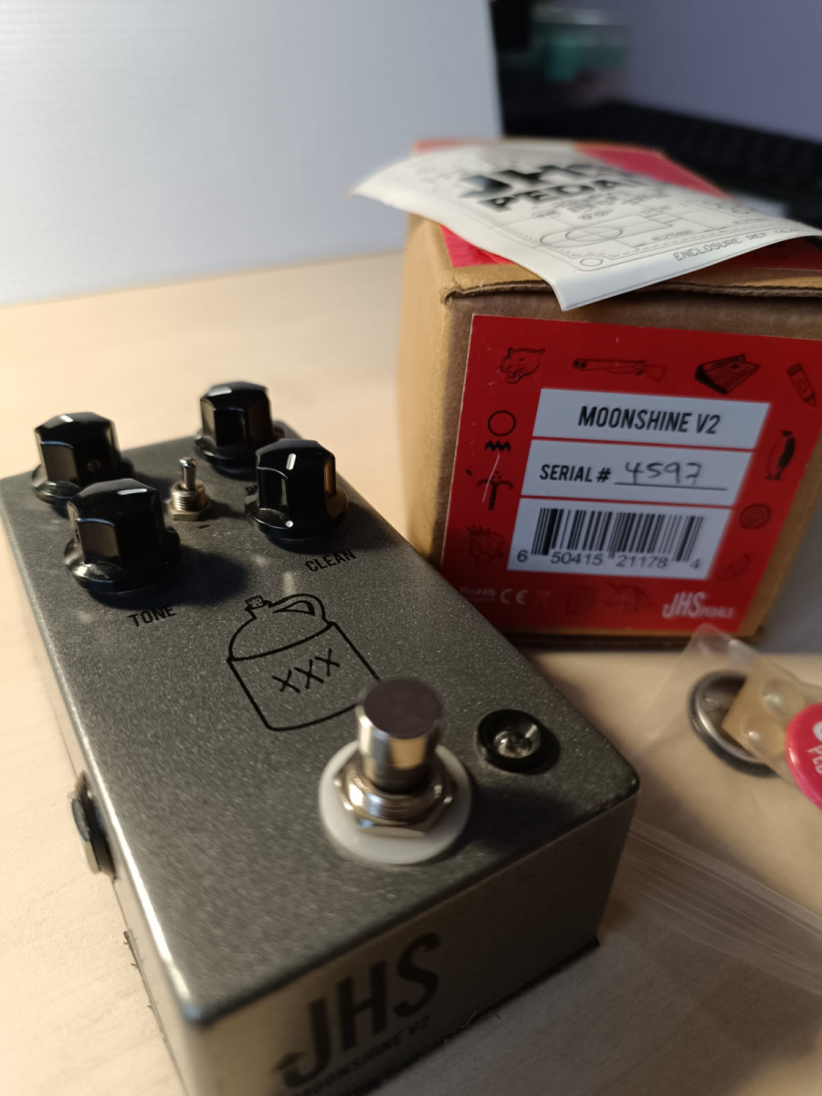 Pedal de overdrive JHS Moonshine V2. Pedal en la linea de un Tubescreamer, pero con mas garra y carácter. Tiene un sonido brutal, y muy versátil gracias a la perilla de Clean (que te permite mezclar la senal limpia).