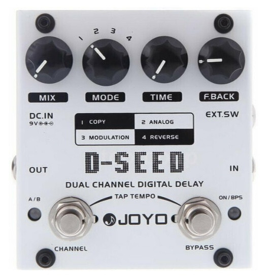 JOYO D-SEED es un pedal de retardo muy flexible, con función TAP Tempo incorporada, que puede ser operado independientemente en cualquier momento para cambiar el tiempo de retardo con facilidad. El DSEED Delay tiene dos canales (presets); Cada uno puede guardar por separado su propio tiempo de retardo elegido, así como otros parámetros relevantes, por lo que tiene diferentes efectos de retardo para usar con su reproducción cuando sea necesario. El tiempo de retraso máximo de D-SEED es de 6 segundos (bajo el modo TAP TEMPO) que cumple con los requisitos de la mayoría de los jugadores. Cuatro tipos diferentes de efectos de retardo de D-SEED: Restaura los sonidos originales de su instrumento sin ningún pulido. Proporciona un tono cálido de imitar los tonos como los anteriores pedales BBD delay y permite un tiempo de retardo de 6 segundos ayudando con la tecnología digital. Un tono de delay con modulación y se caracteriza por una amplia y rica sensación de espacio, especialmente cuando se tocan tonos limpios. Un efecto muy interesante e invierte la fase tardía para crear un sentimiento muy psicodélico.