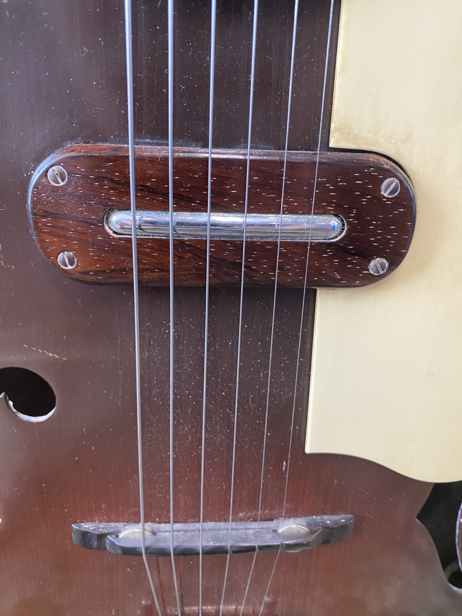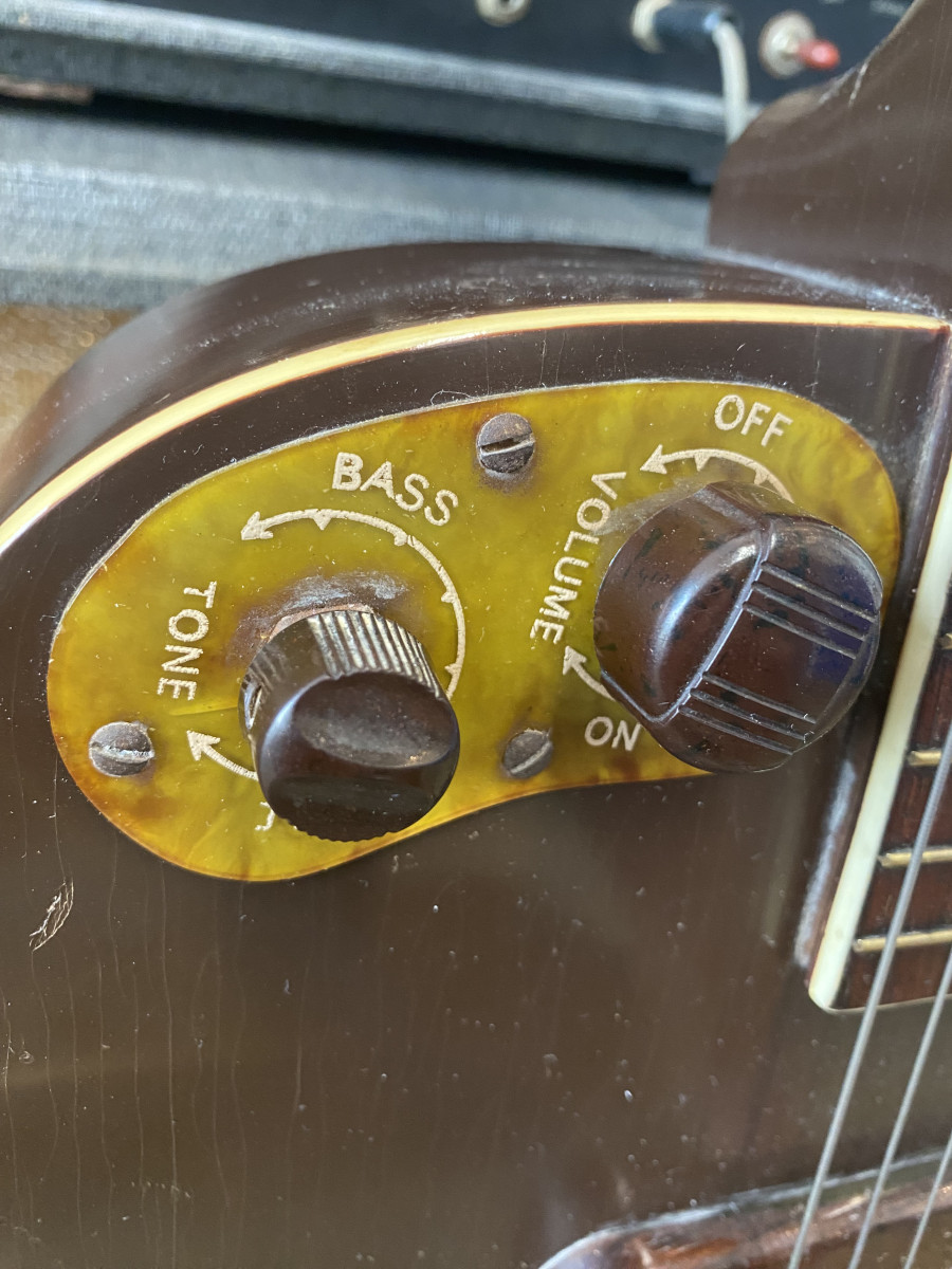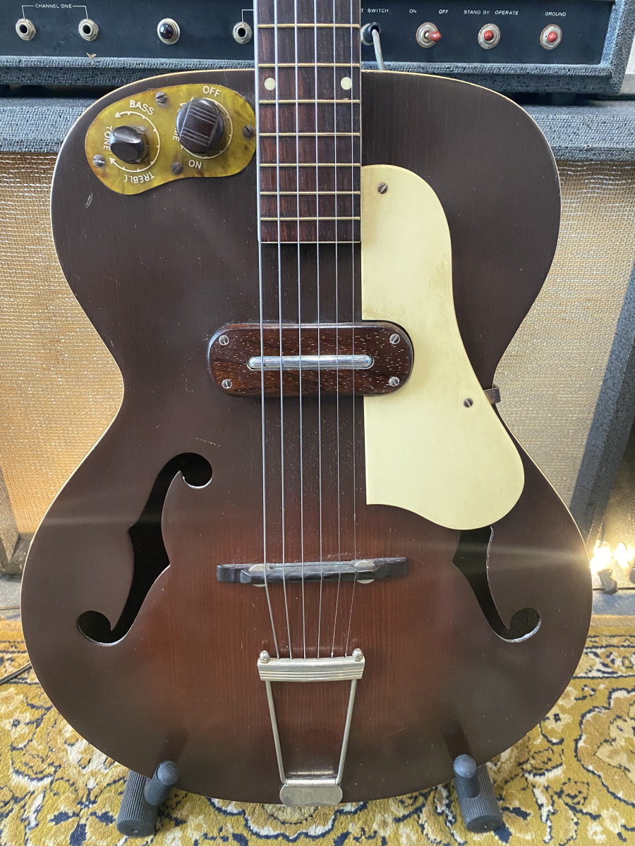 Es el turno de esta joya de los años 40, una Kay F-451 con su característica pastilla lipstick y sus controles con acabados de madera. Comprada en el Guitar House of Tulsa (Oklahoma). Está impoluta (increíble para sus más de 80 años). Mástil generoso; ahora mismo lleva cuerdas de entorchado plano. Un pedazo de historia de la música americana. Viene con funda acolchada. 800 €. Para envíos consultar. NO CAMBIOS y NO REGATEOS. Si la pruebas te la quedas. Mojo a raudales.