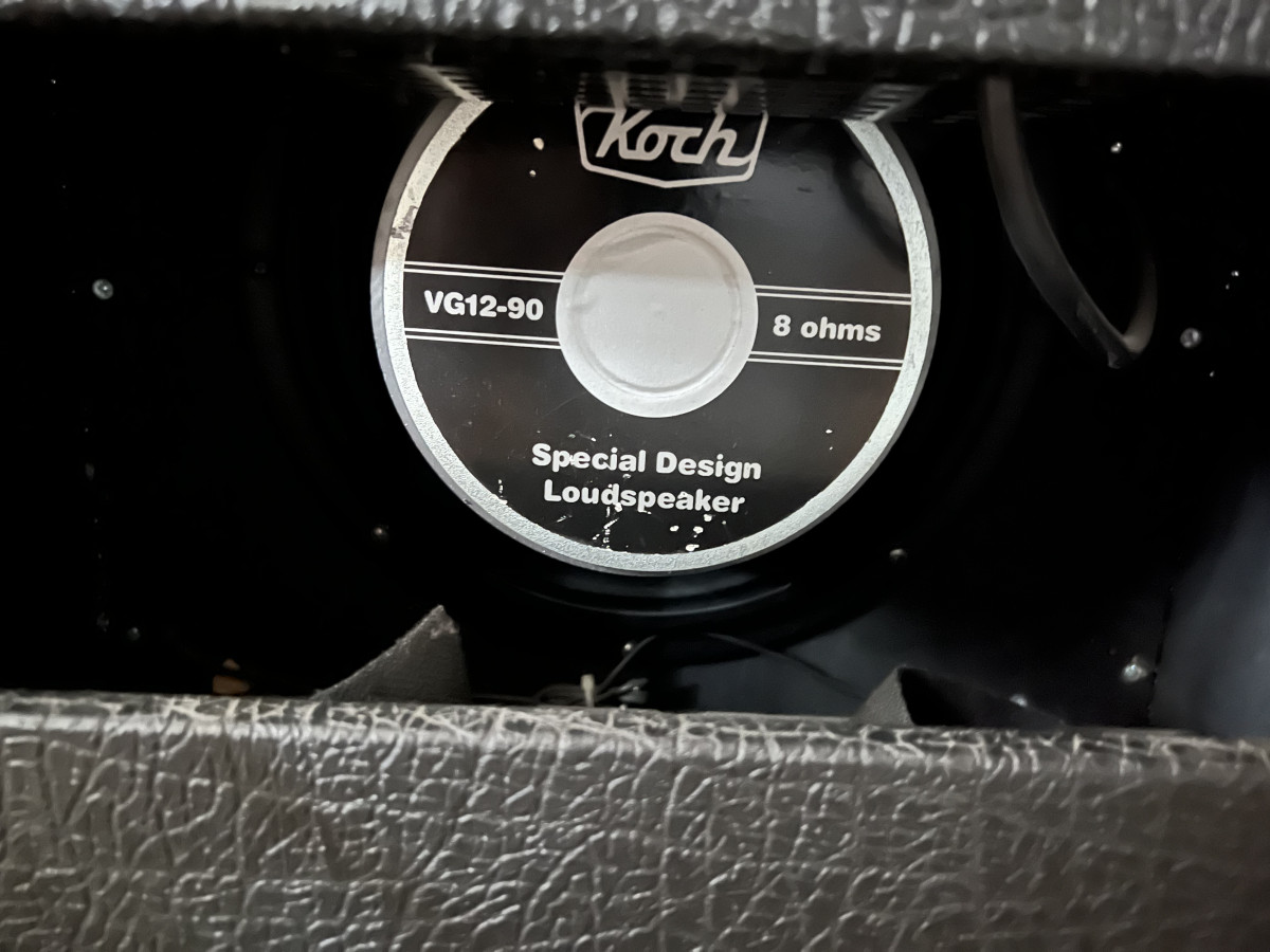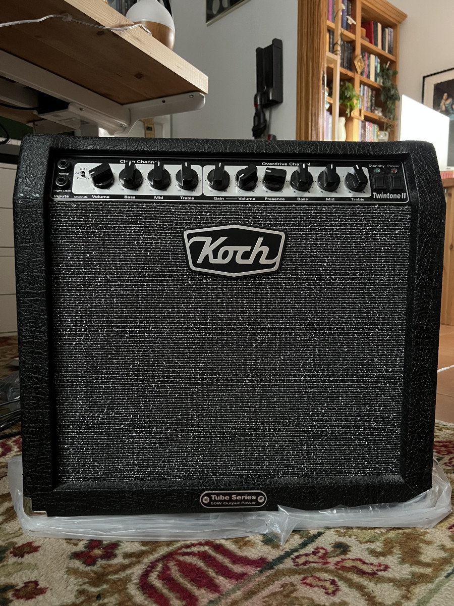 Combo amplificador de guitarra Koch Twintone II. Válvulas 4x12AX7 y 2xEL34. 50w conmutables a 25w. Salida de cascos con emulación de altavoz. Tres canales (clean, crunch y distorsión), y reverb y boost para solos conmutables con pedal. Funciona genial por sí solo y como plataforma de pedales.
