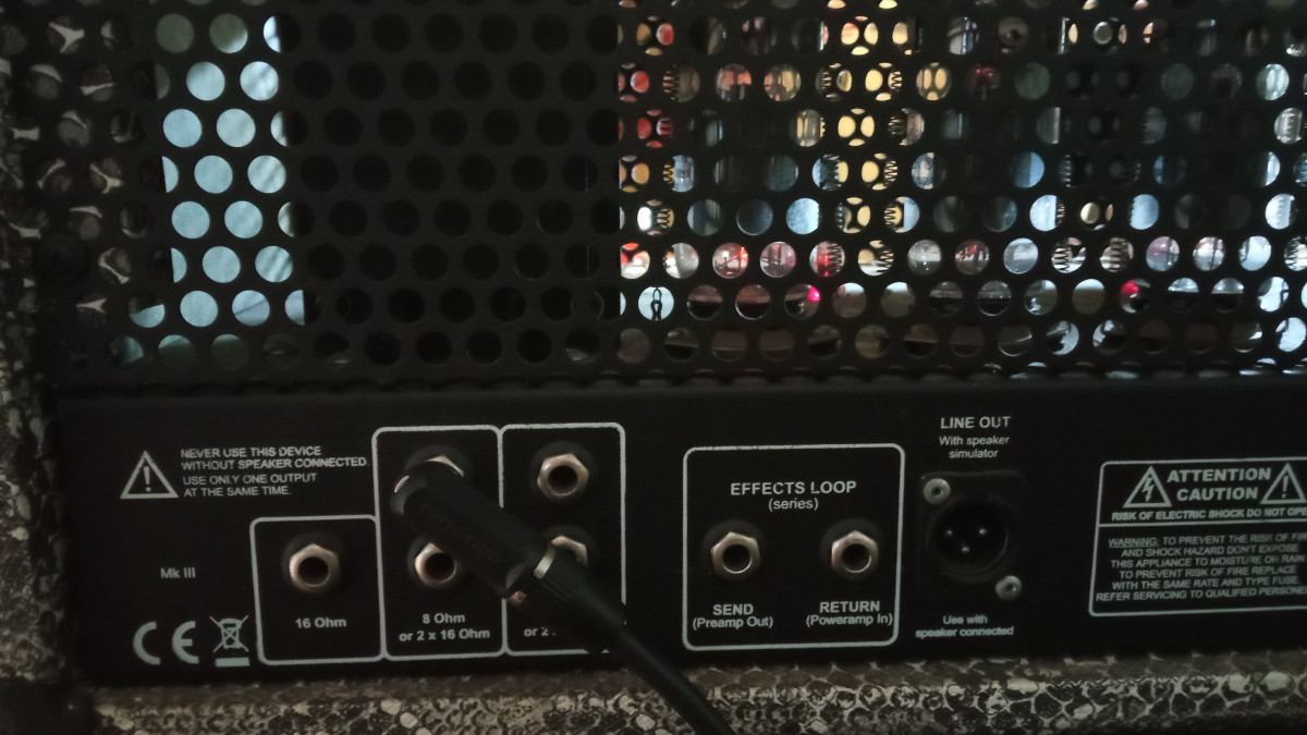 La pantalla tiene trote, se ve en su tolex y se le retiró el logo de la rejilla, pero está en perfecto estado de funcionamiento. Selector de entrada Mono/Stereo a 8 ohm.
