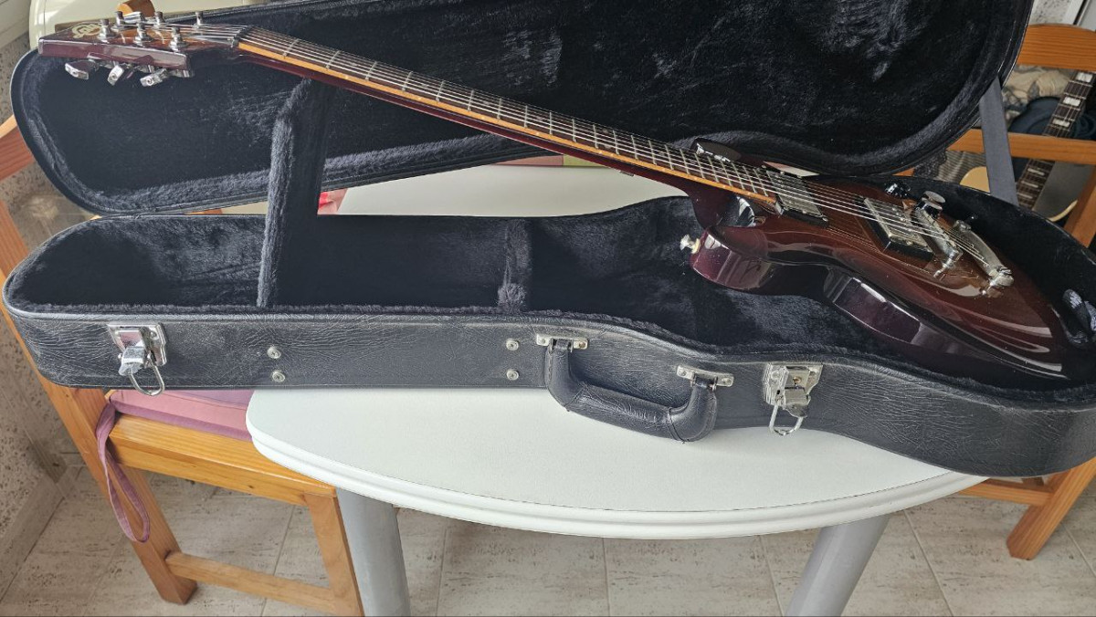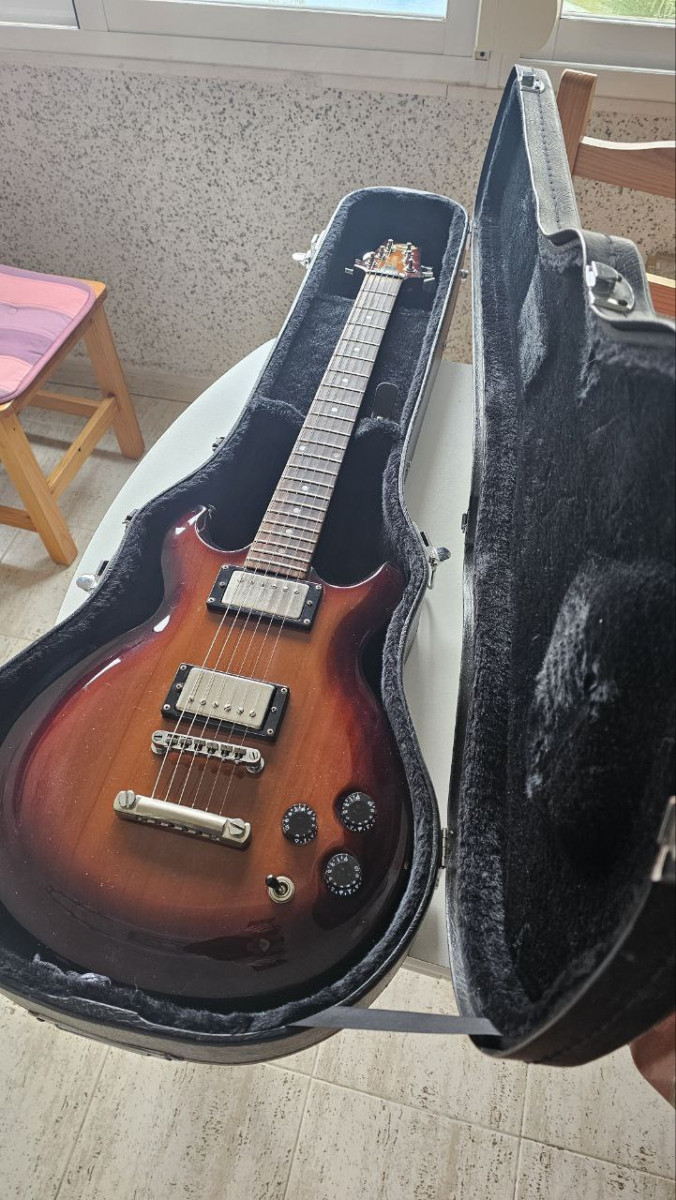 Fabricada en 1999 en Francia, 1 pote de tonoo push pull, 1 volumen independiente para cada micro. Mástil super cómodo (C medio), similar a una PRS, cejilla de grafito, pastillas Seymour Duncan (PAF 59 SH1 en mástil y SH4 Jeff Beck en puente. Cuerpo de caoba con tapa arqueada, mástil de arce de Canadá y diapasón de palisandro de 22 trastes Jim Dunlop USA medianos. Escala Gibson de 630 mm. No cambios.