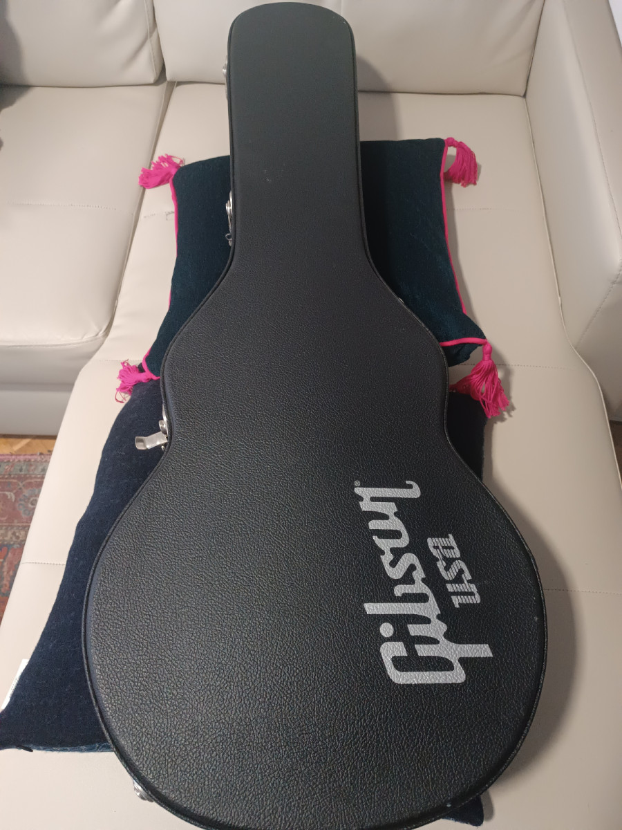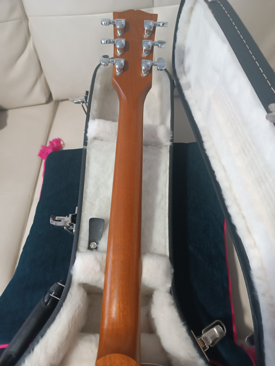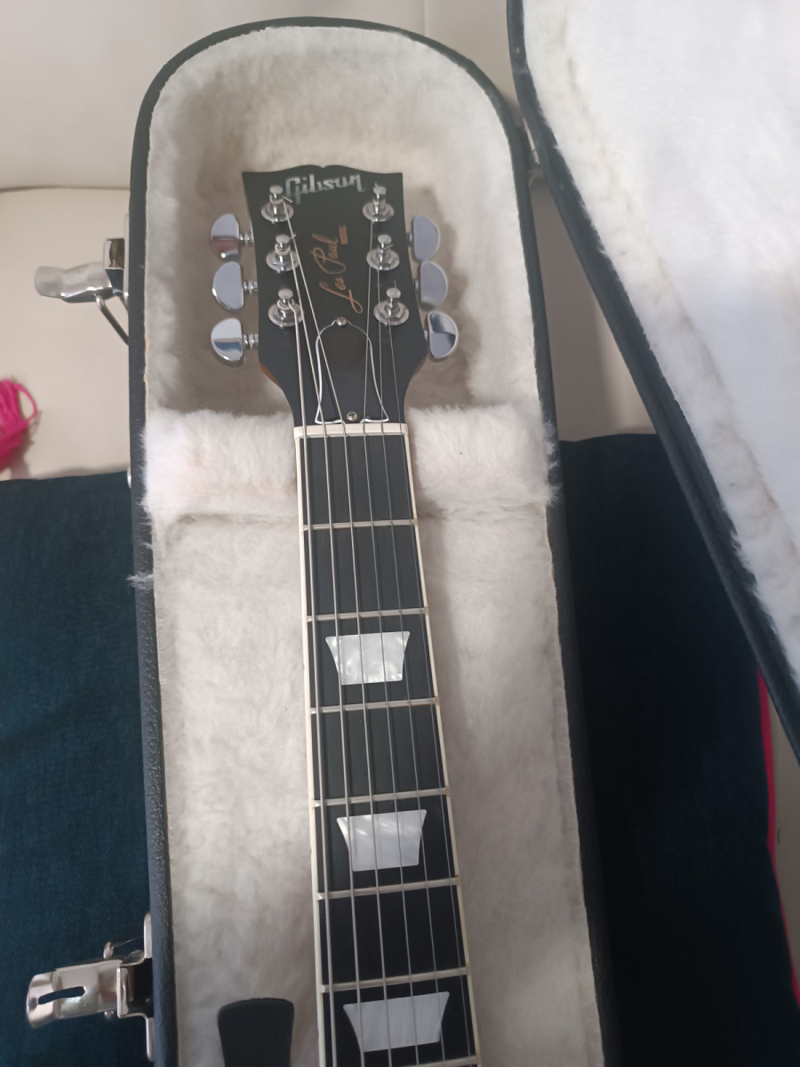 (1) La funda no es la original, sino que es de otra Les Paul de 2013 (esta guitarra la obtuve por un cambio por esa otra LP de 2013 y el dueño anterior prefería cambiar sólo las guitarras y que cada uno se quedase con la funda de la suya).
