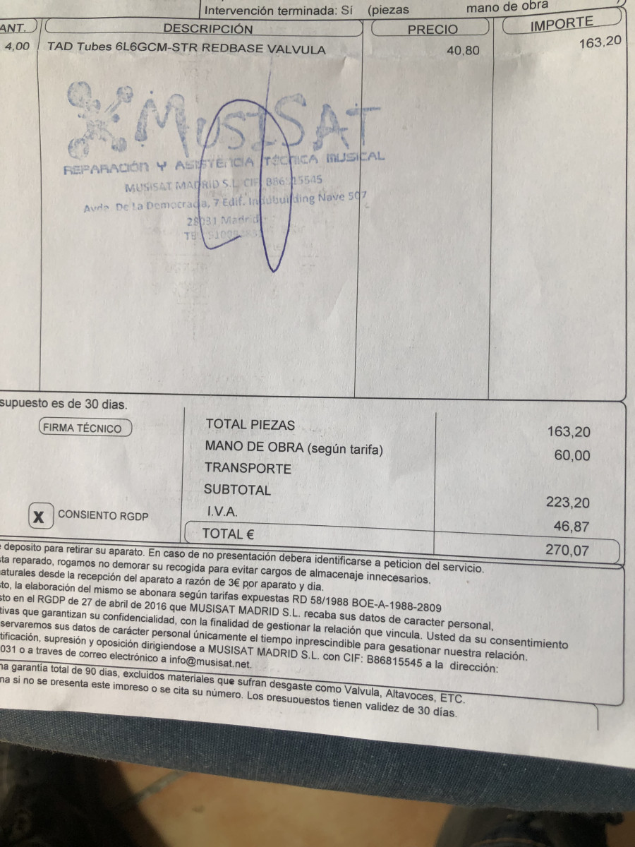Efectos bucle 1/4' (entrada de potencia q salida de preamplificador) VENDO POR FALTA DE USO , VALVULAS DE POTENCIA RECIEN CAMBIADAS Y AJUSTE DE VIAS , A TODA PRUEBA , ES UNA BESTIA PARDA., ADJUNTO JUSTIFICANTE DE EL CAMBIO DE VALVULAS .