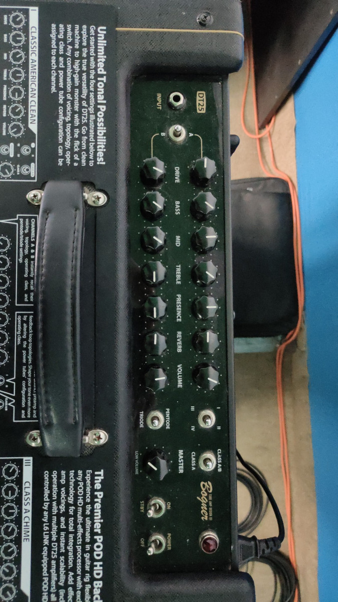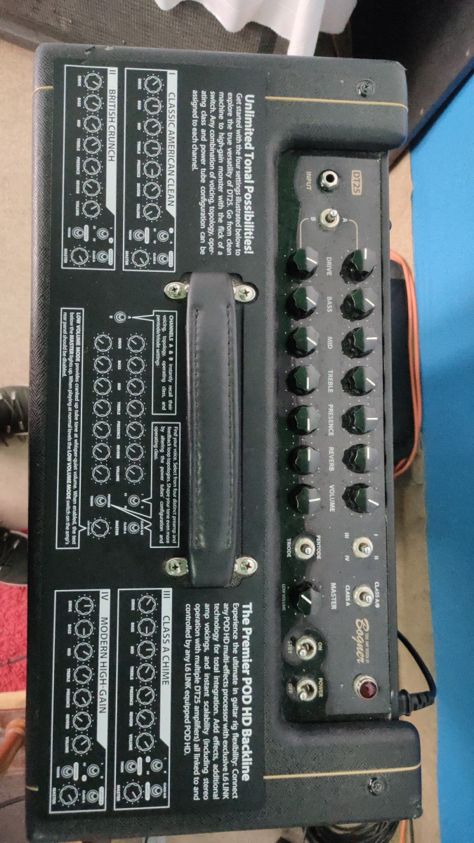 Hola, vendo este combo Line6/Bogner DT25. Recien revisado, con factura. Valvula de previo JJ 12AX7 nueva, valvulas de potencia EL84. No me voy a extender en las caracteristicas porque son un monton, el que lo conozca ya sabe lo que hay, y el que no, que me pregunte sin compromiso. En perfecto estado salvo por un par de rasguños en el tolex en las esquinas inferiores. No cambios, envio a cargo del comprador. Whatsapp 688 687 567.