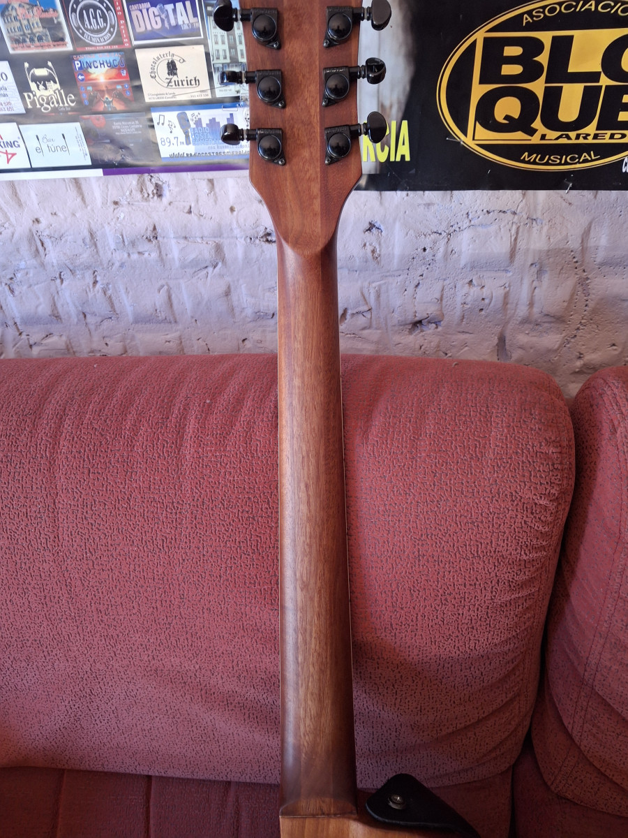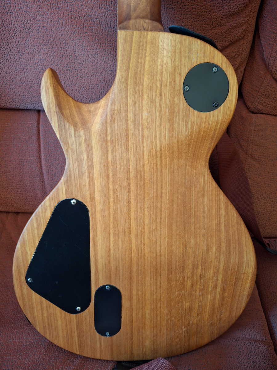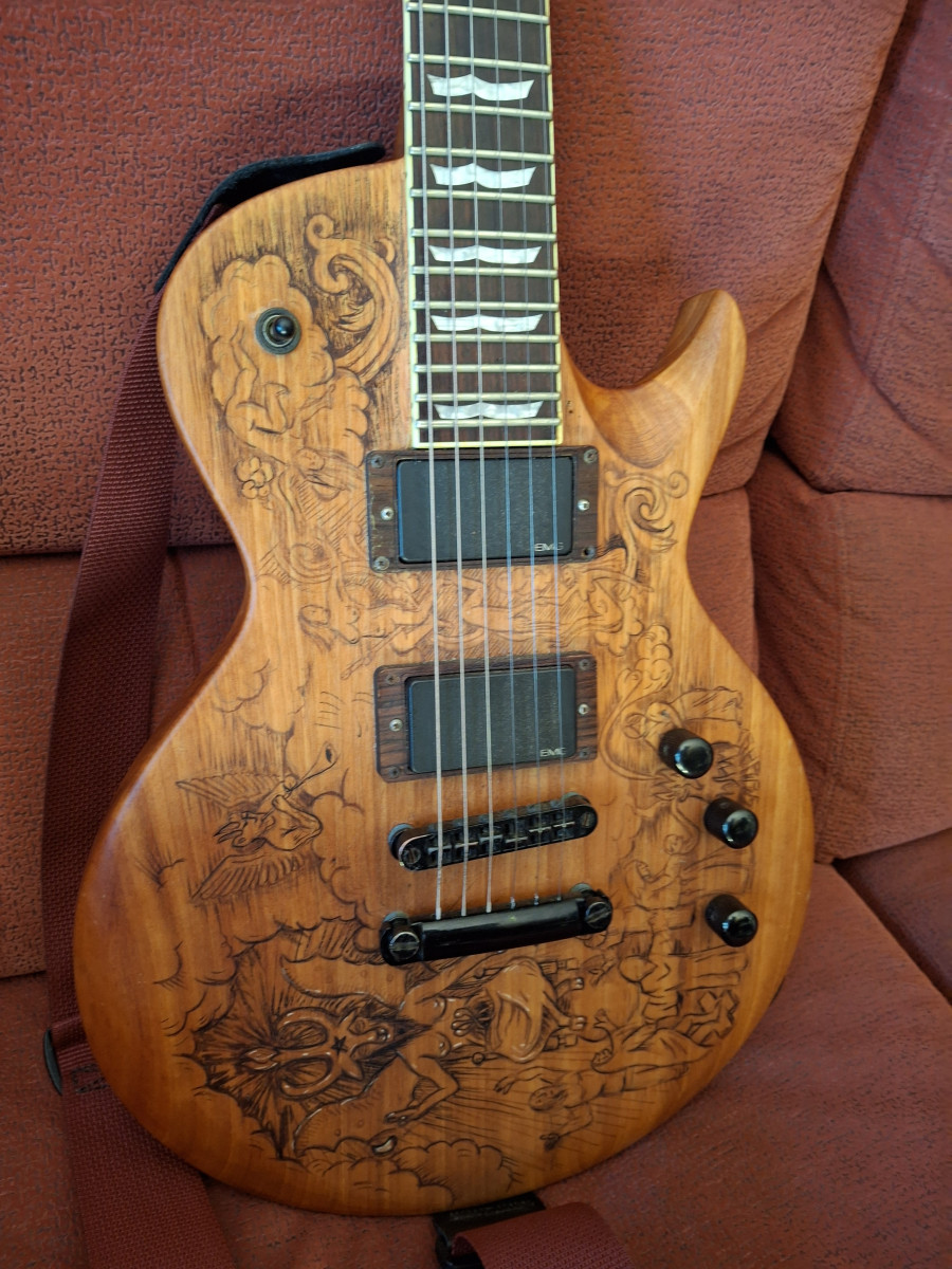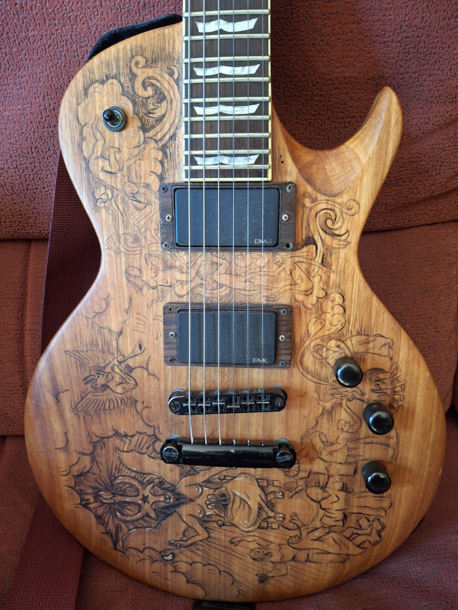 Se vende LTD EC-400 con acabado personalizado. Para el acabado se ha eliminado el acabado original y se ha realizado un grabado en la tapa a poro abierto, con un barnizado ligero natural en la parte trasera y el mástil.