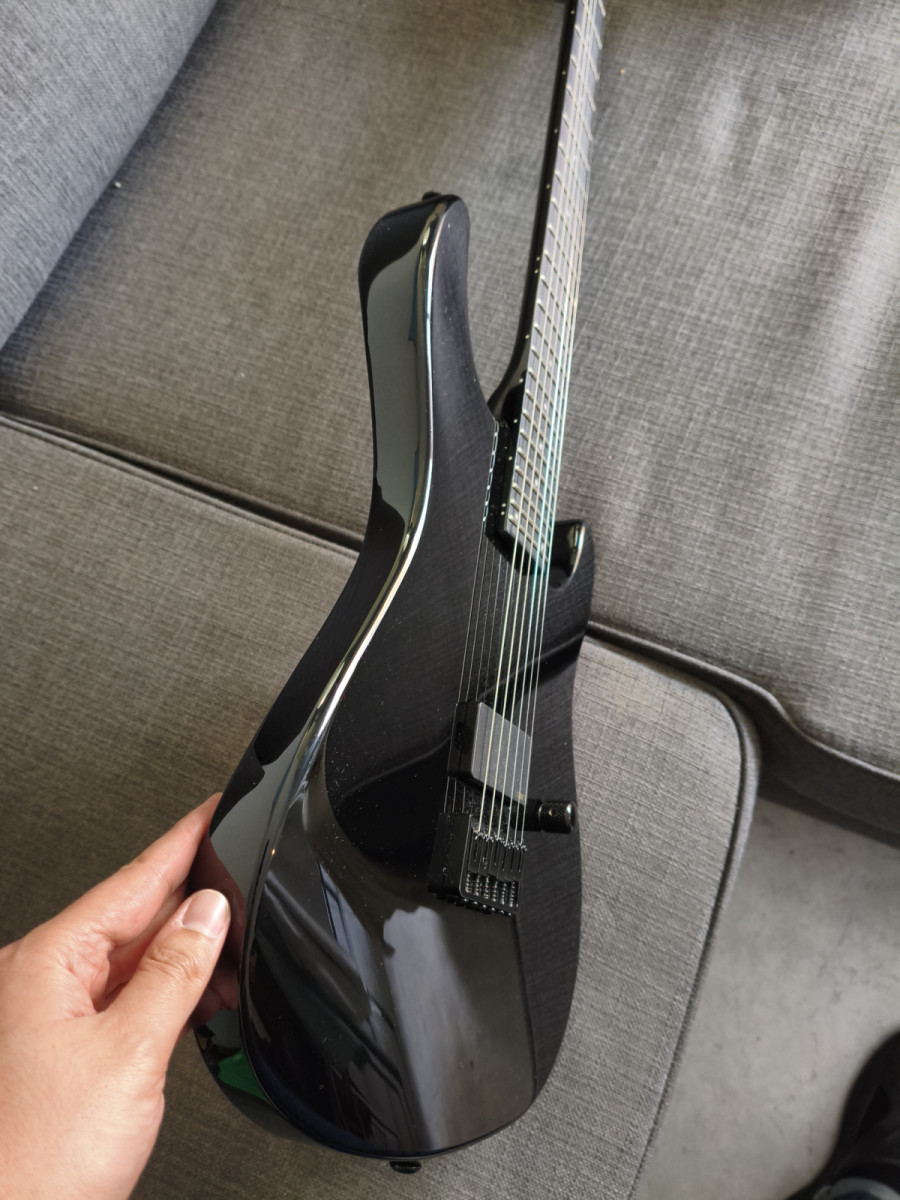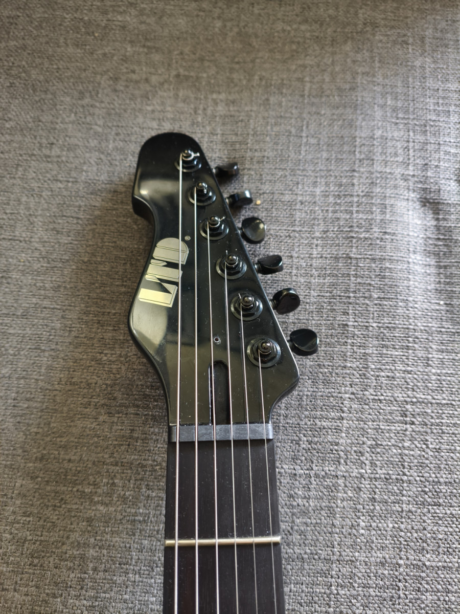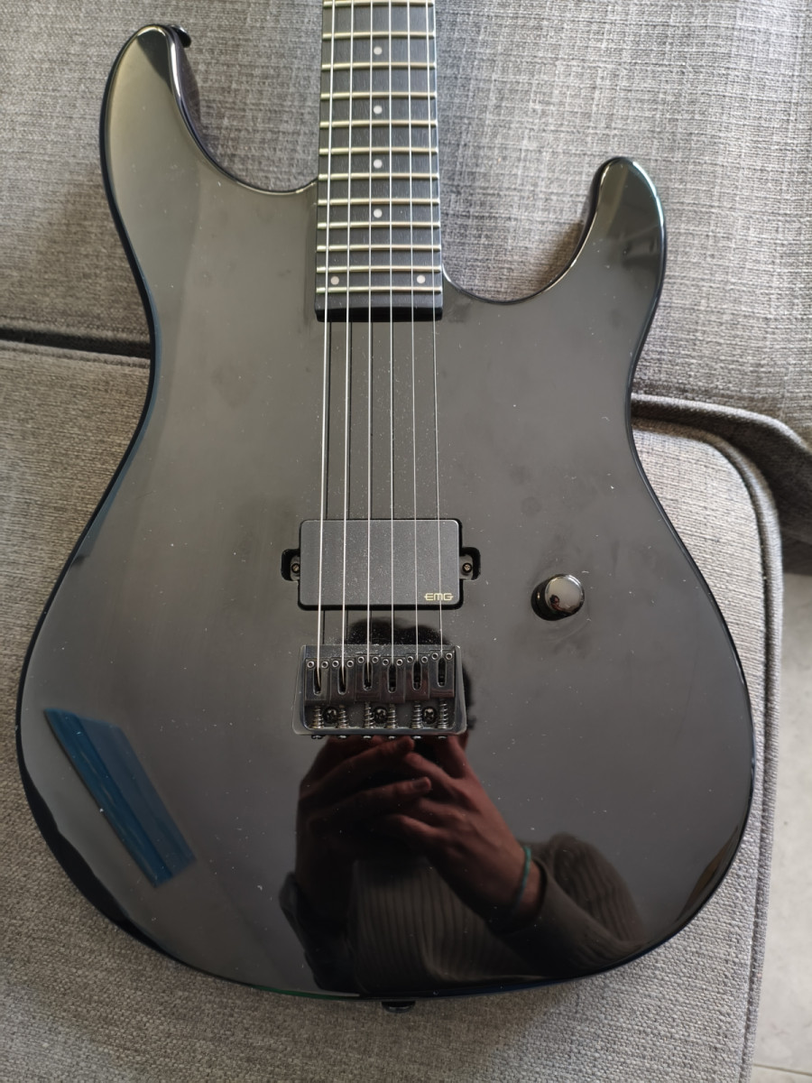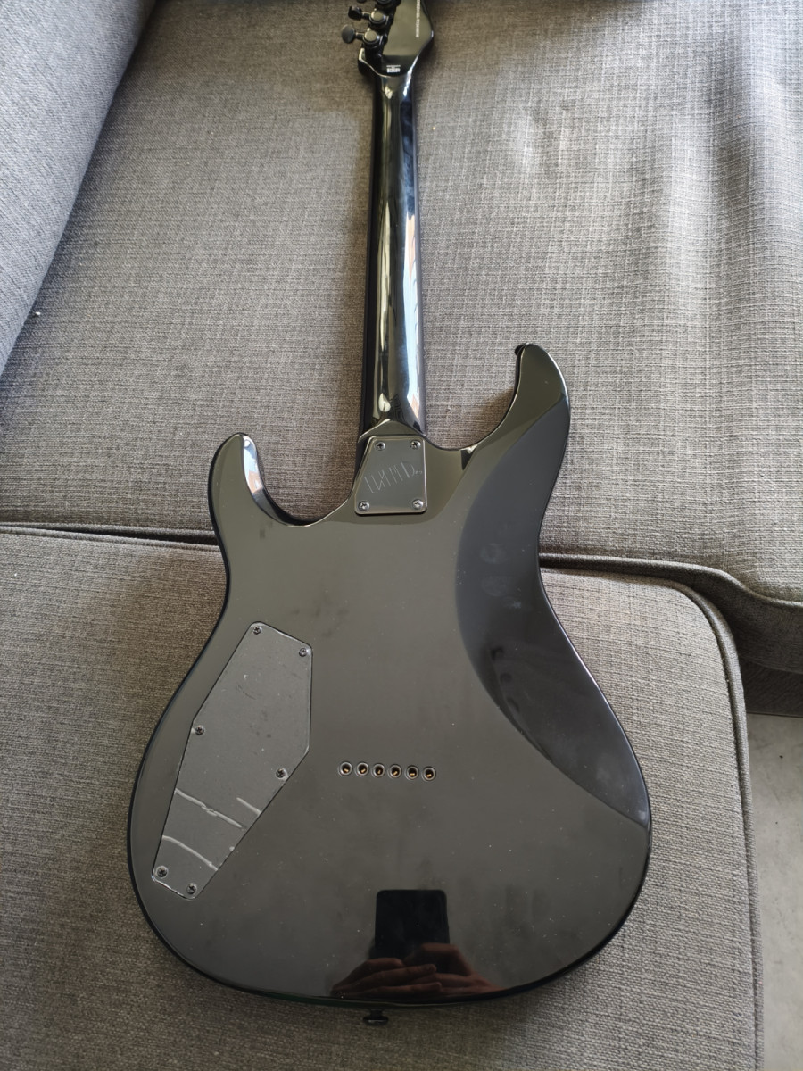 Cuerpo de caoba, mástil de 3 piezas de arce, diapasón de palorrosa muy oscuro y bien hidratado, con 24 trastes XJ para volar por el mástil. Al contar con una única pastilla y puente hardtail, la guitarra está hecha para metal puro. La pastilla original, a pesar de ser una ESP LH-150B, era totalmente infame. Sonaba horrorosa, no sé si la mía salió mal o qué, pero la cambié inmediatamente por una EMG H4A pasiva y ahora suena a gloria bendita. El clavijero fue cambiado por uno de bloqueo de marca blanca, bastante resultón. Incluyo el pote original con coil split y el clavijero de serie. La pastilla la he dado con fines solidarios para cambiar el imán y demás, ya que era horrorosa. Incluyo funda blanda de la marca ESP, además de tener la caja original de la guitarra.