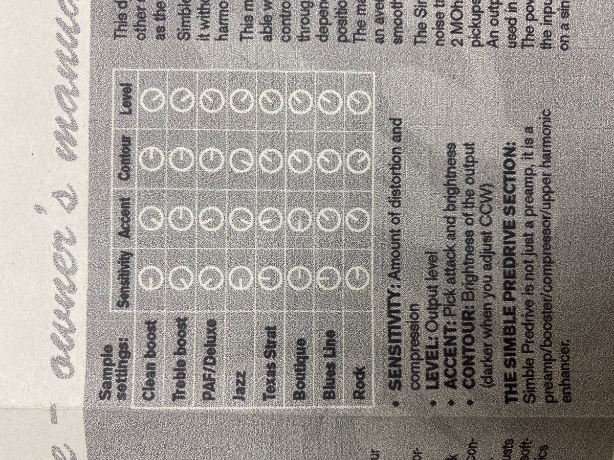 Sensitivity: Controls the amount of distortion and compression. Sensitivity goes from totally clean Tweed sound to higher gain. At 12 o'clock there are Blackface-type overdrive sounds and toward 5 o'clock the sound goes almost to Big Muff territory. Regardless of the amount of gain Simble cleans up excellently with the guitar's volume control.