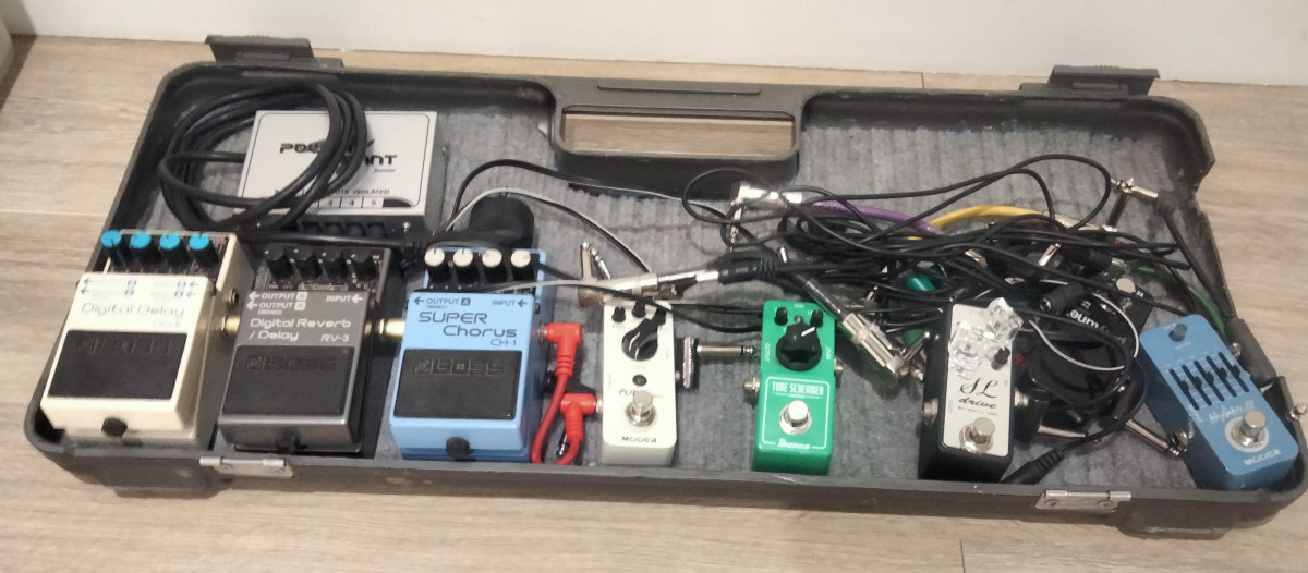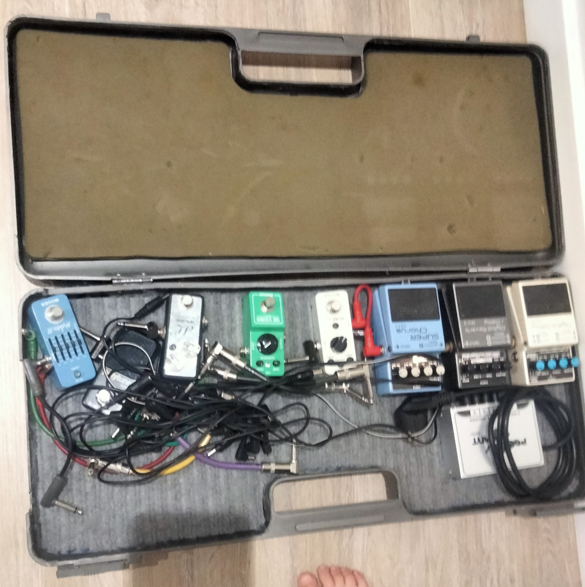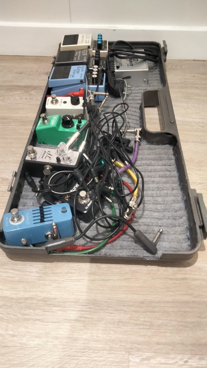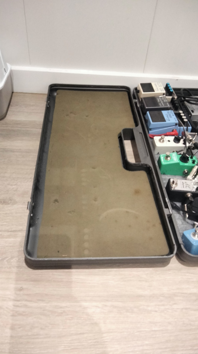 Maletín rígido para pedales de guitarra. Está en buen estado, aunque presenta algunas leves señales de uso.