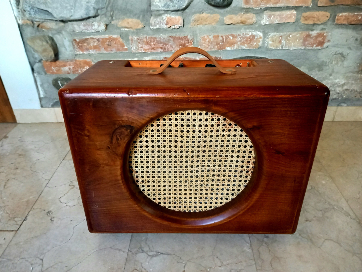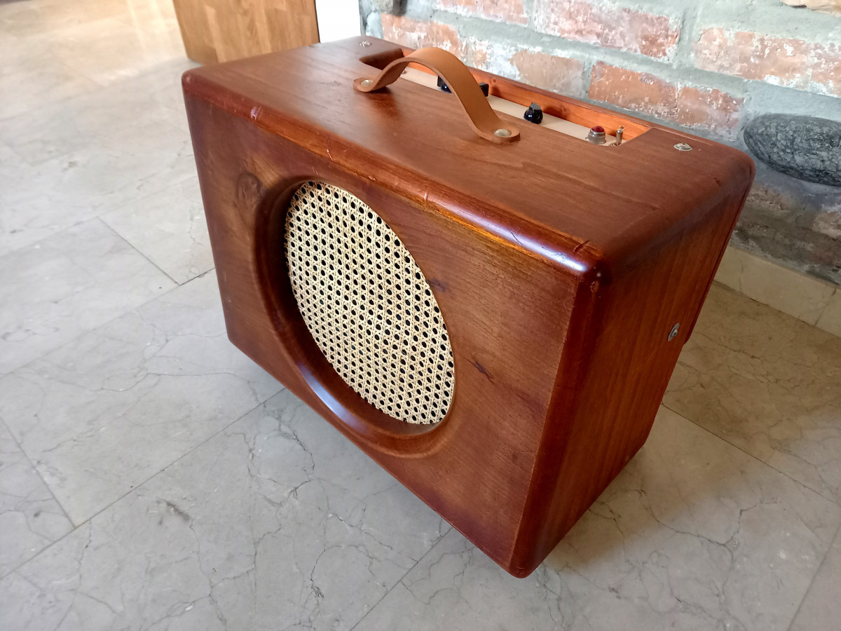 Va montado en una preciosa pantalla del luthier Marcos Jiménez en Pawlonia maciza superligera y frontal de nogal español de una sola pieza y de 30 años de secado natural. Está barnizada con nitro satinada y lleva tb el asa de cuero auténtico de vaca. Sólo 10Kgrs aprox. Súper fácil y muy cómodo de llevar a cualquier bolo. A bajo volumen suena brutal!!