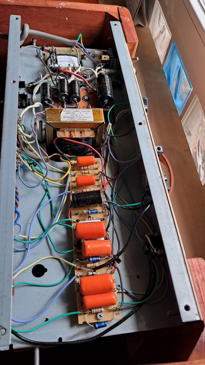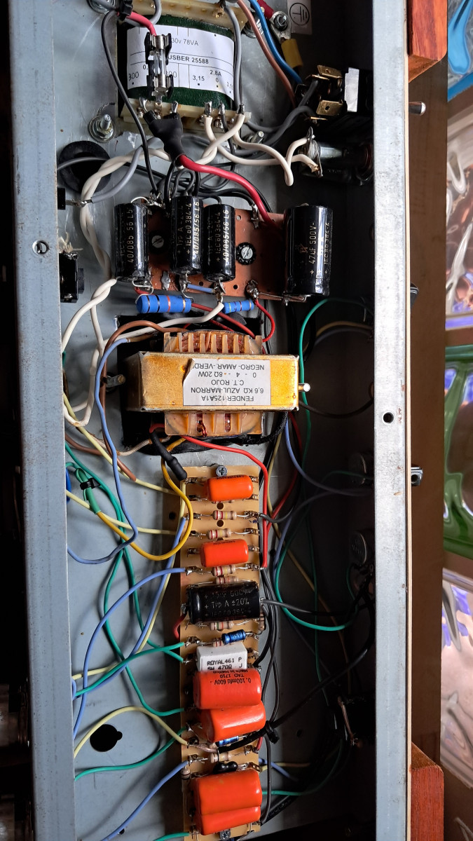Amplificador a válvulas monocanal soldado punto a punto con trafos Fender y condensadores Orange Drop de 20W.