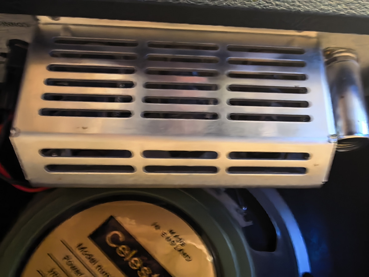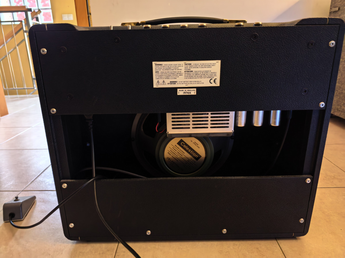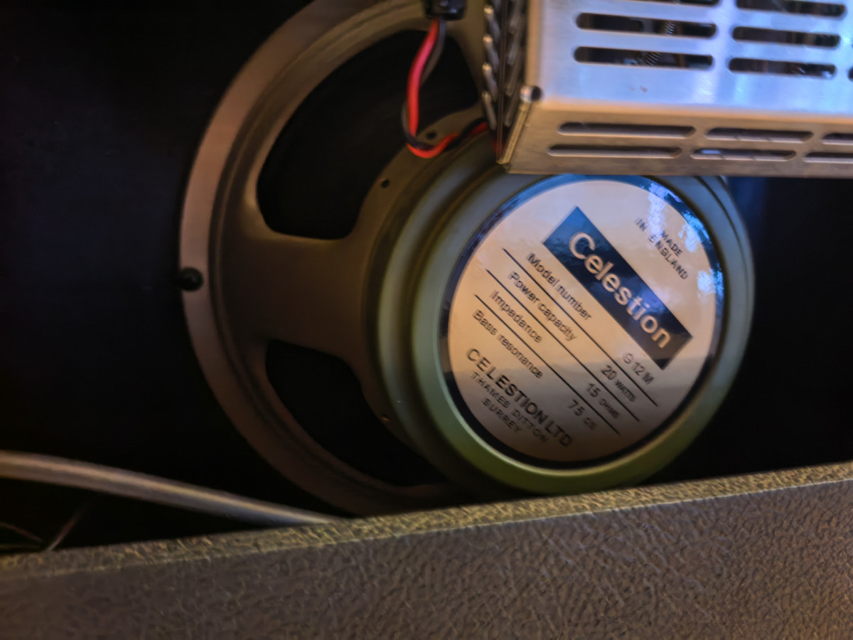- Altavoz: Celestion G12M Greenback "Aged" original, Made in England. Al tener 15 años, el cono ya está "abierto" y suena espectacular, sin la dureza de los nuevos.