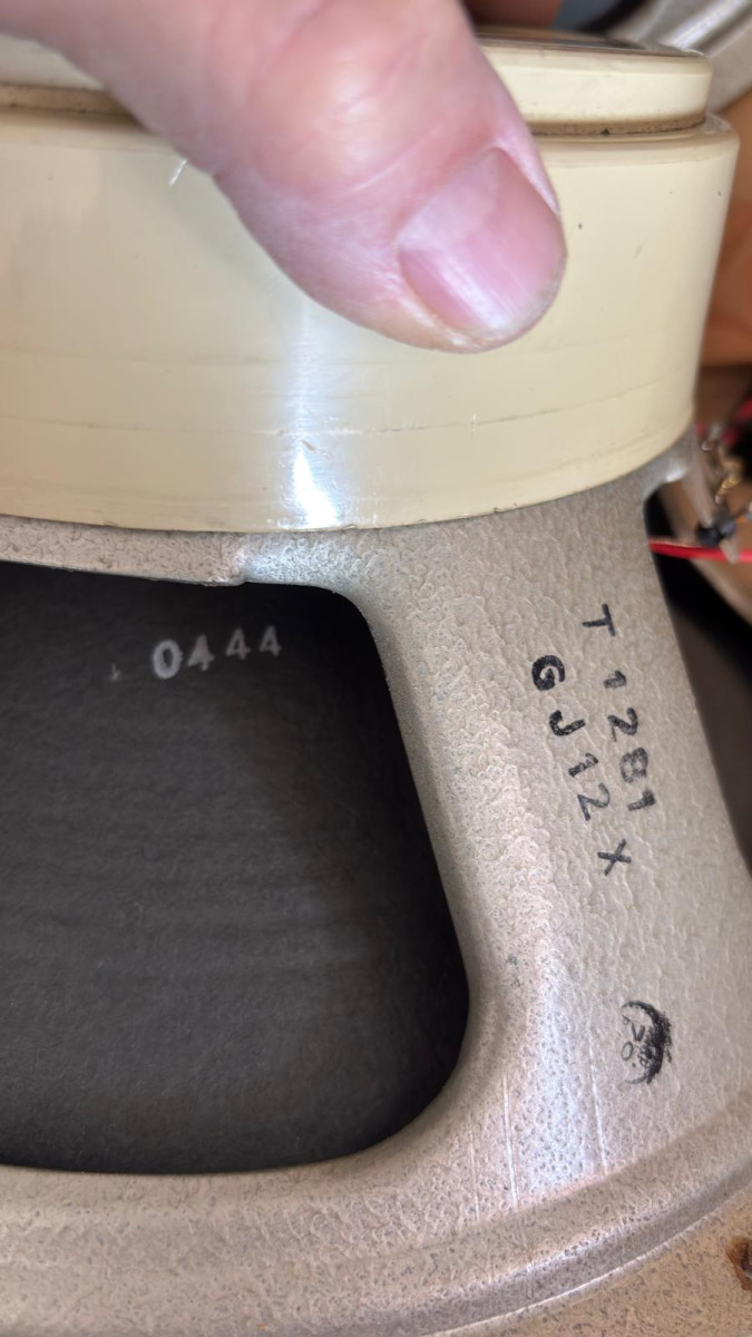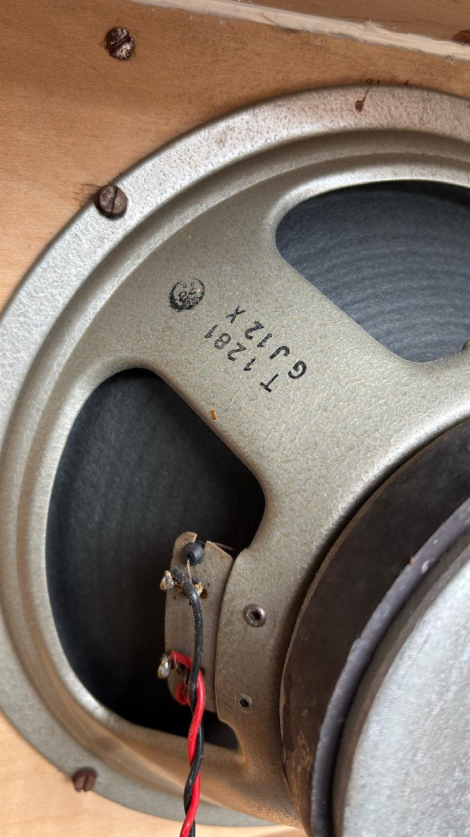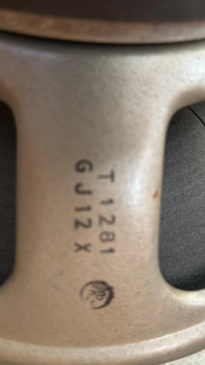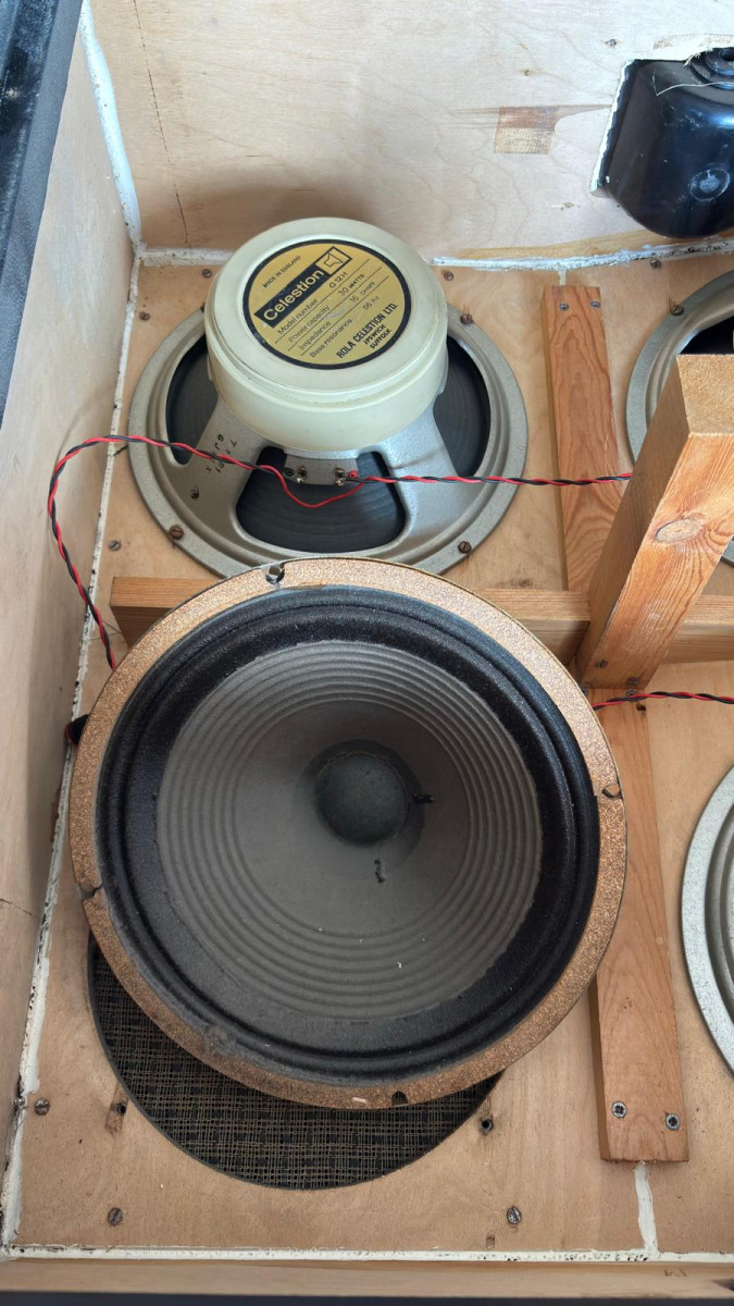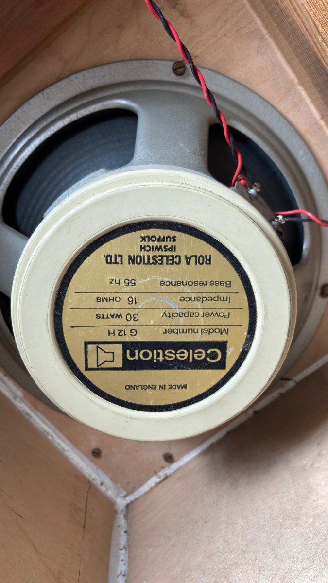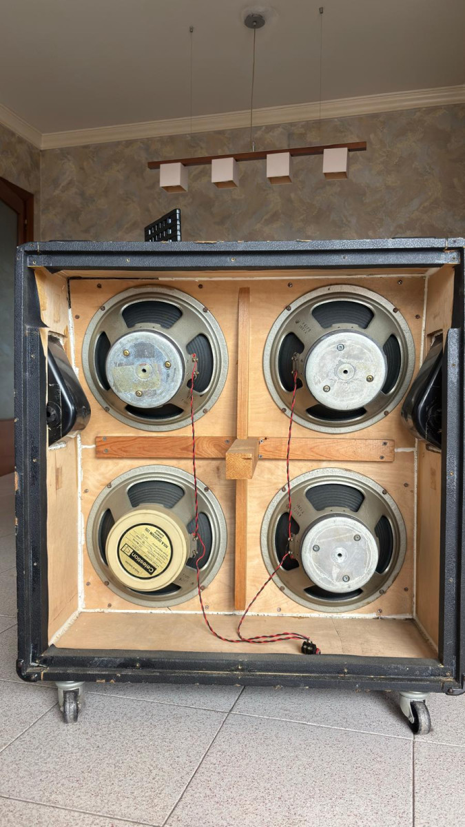 La caja 4x12, cuando la compré en 1990 la abrí para ver qué altavoces montaba. Los altavoces estan como en ese momento, hay tres a los que les falta el cover del imán. En aquel momento los desmonté y comprobé que nunca habían sido re-coneados. No teníamos la información de ahora https://www.bygonetones.com/vintage-celestion-guitar-speaker-cones.html . Apunté los códigos, los he vuelto a chequear y he hecho muchas fotos.