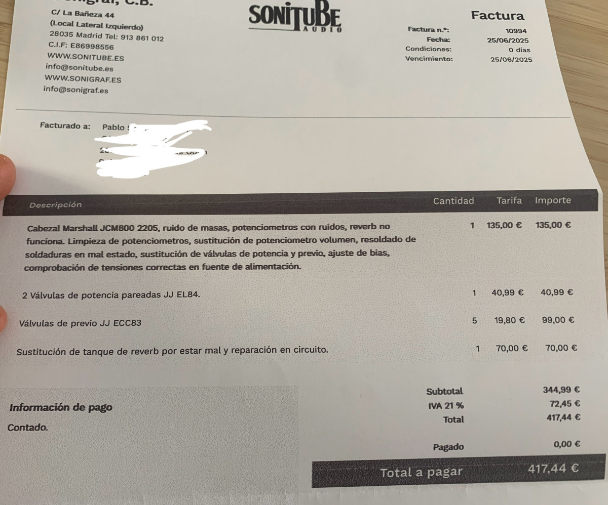 Pasó un revisión completa en Sonitube este 25 de junio y se le cambiaron las válvulas y el tanque de reverb (adjunto la factura, que asciende a 417€).
