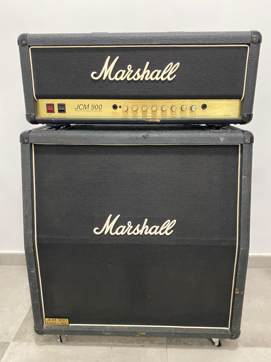 Vendo amplificador de guitarra Marshall JCM900, 100W, con pantalla 4x12. Está en buen estado, aunque muestra señales normales de uso.