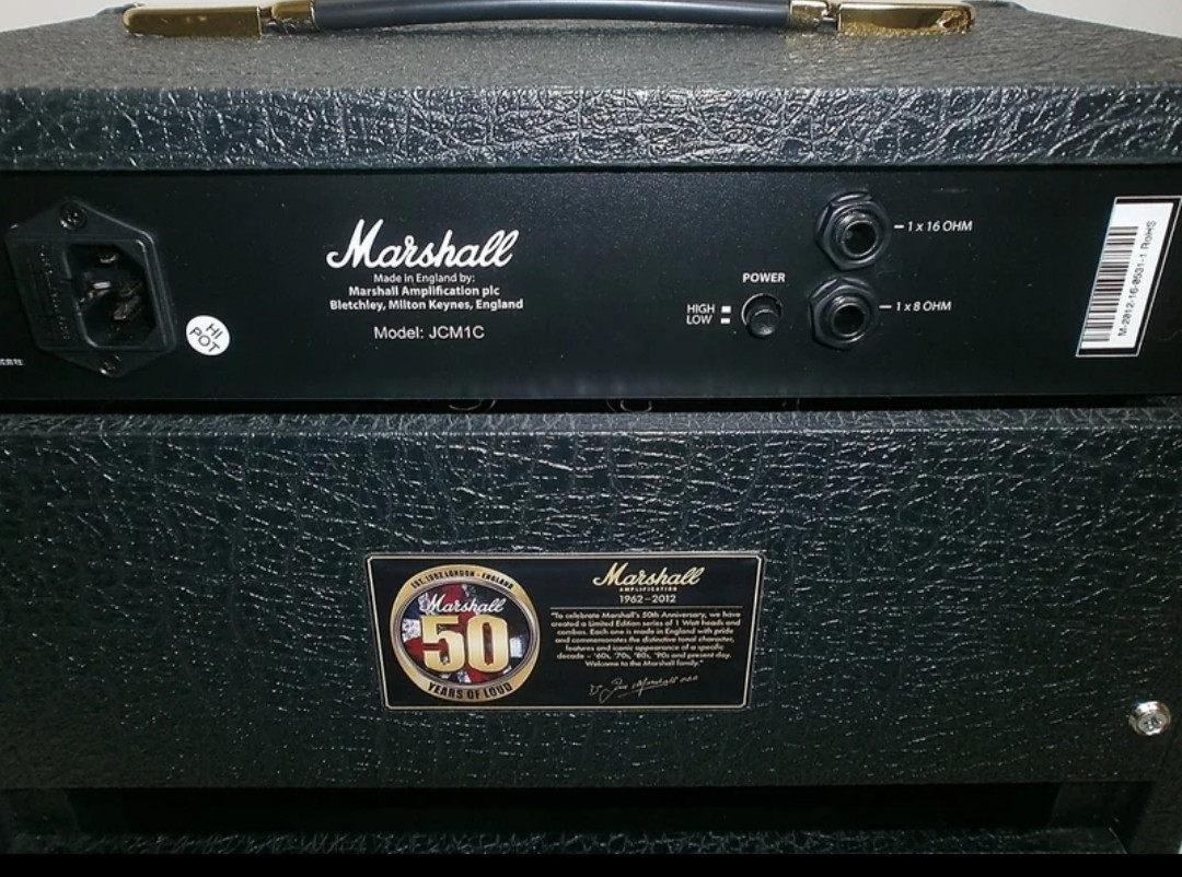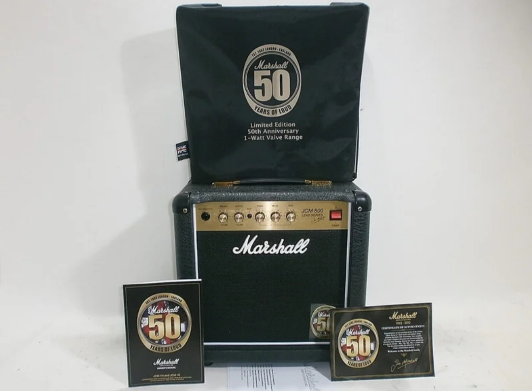 Amplificador de válvulas Marshall JCM800 50th Anniversary, edición limitada de 1 watio / 0'1w. Perfecto para obtener ese sonido clásico de Marshall a volúmenes razonables y descatalogadísimo.
