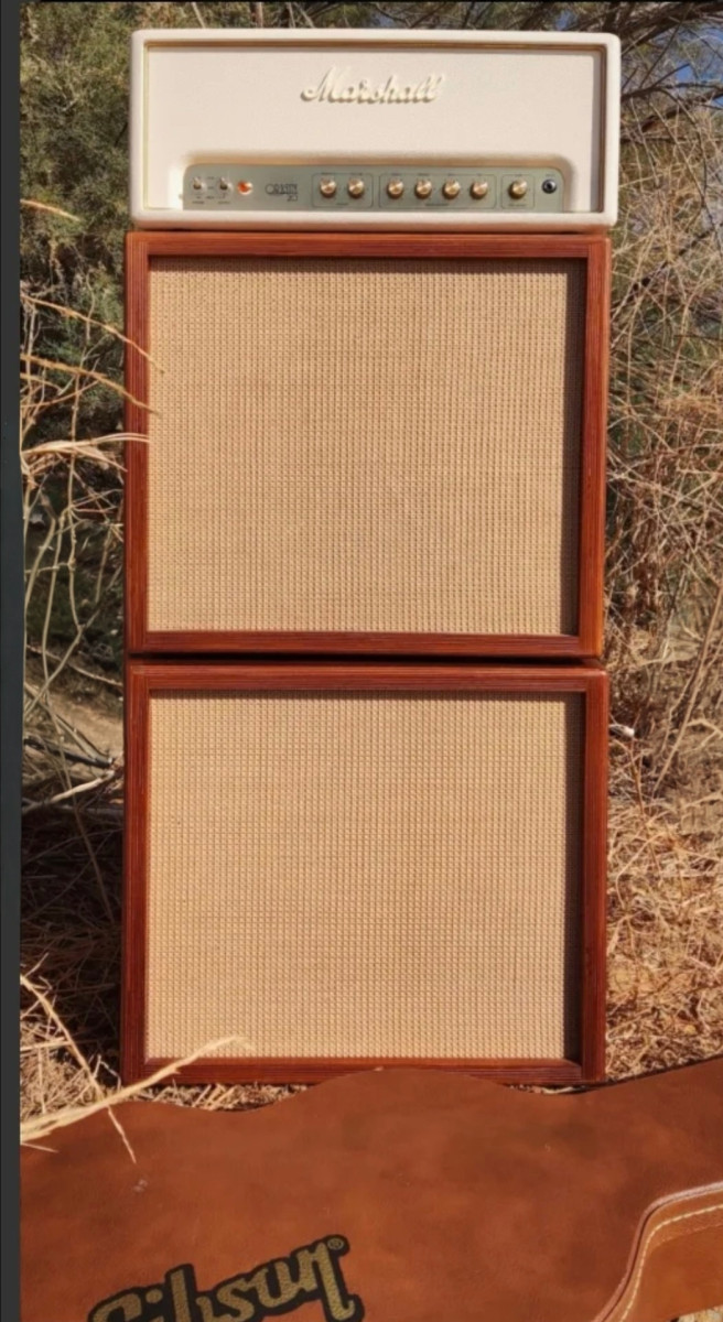 El cabezal es una edición especial que está descatalogado y es muy complicado de encontrar en este acabado, las cabinas también. Se tratan de dos Sinmarc descatalogadas, en configuración de 1x12 y la otra de 4x8 para sacar todas las frecuencias al amplificador. Los conos sinó me equivoco son Beyma y Celestion, suena increíble, invito a probarla porque sorprende, sonido añejo Marshall 100%