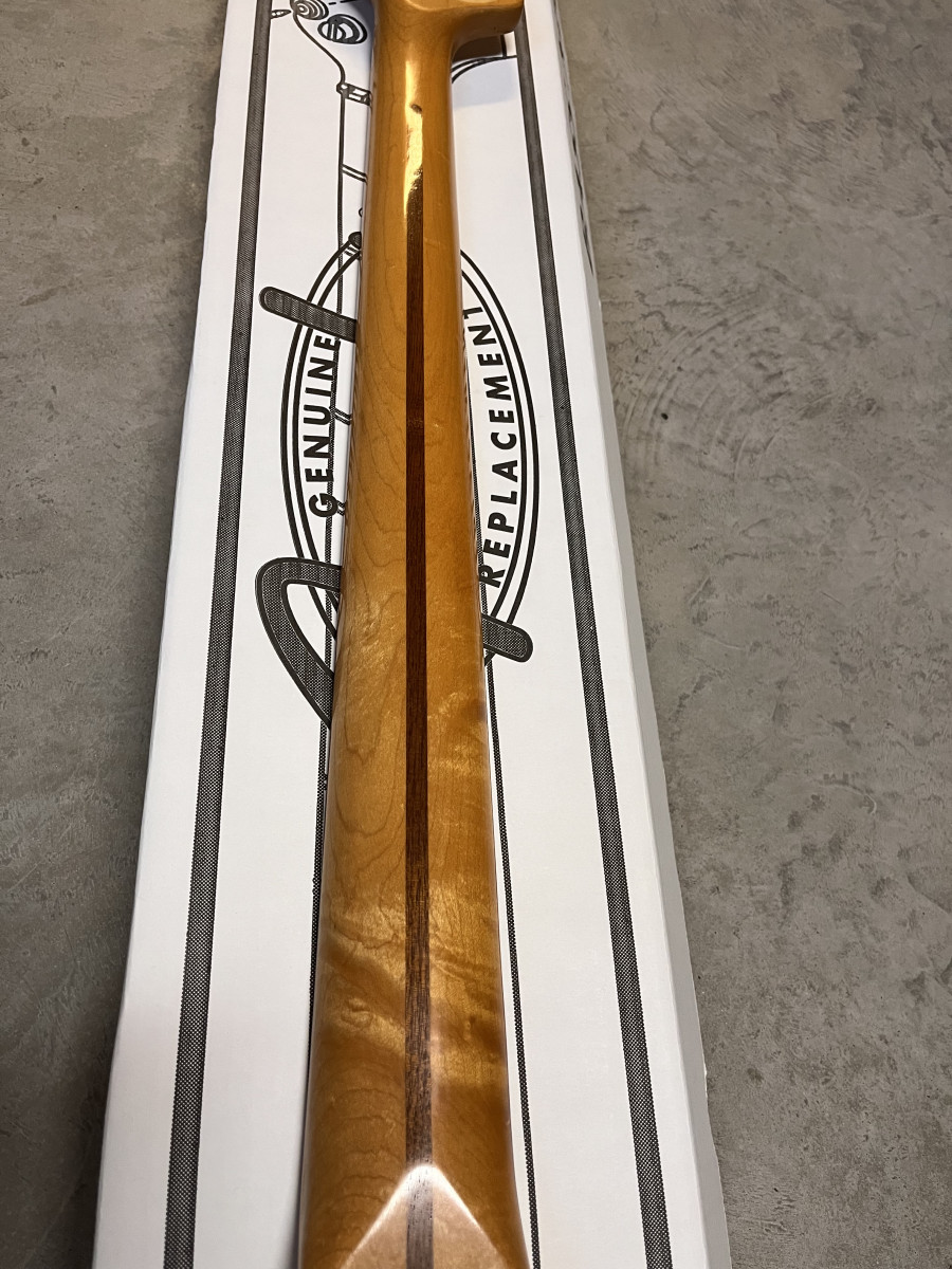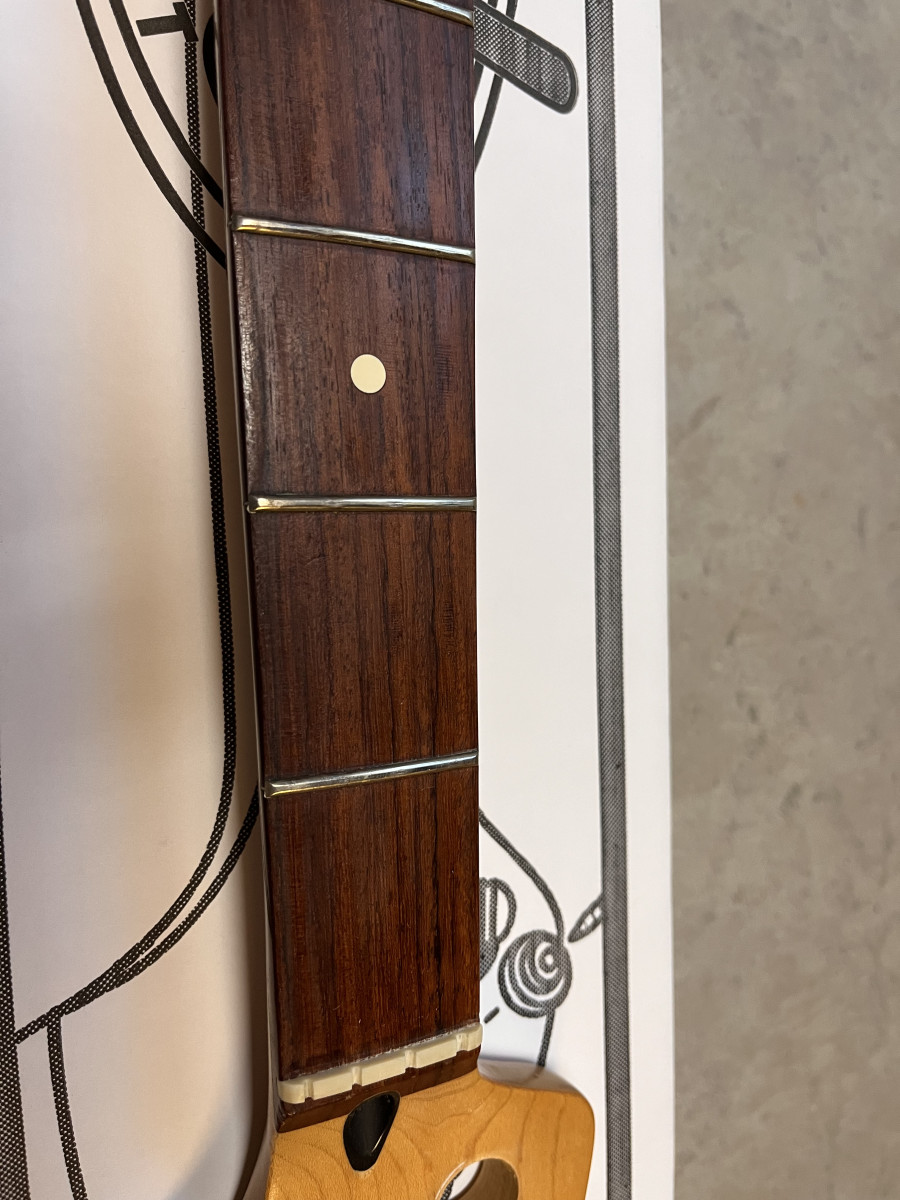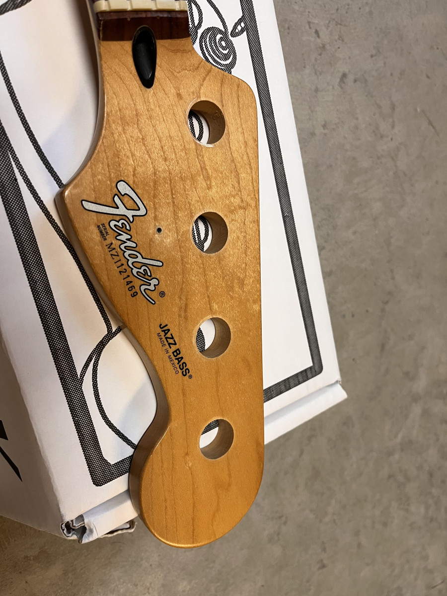 Mástil de Fender Jazz Bass mejicano de 2001. Radio 9.5 y diapasón de palidandro. Trastes en perfecto estado. Bonito dibujo de la madera, tanto en el palisandro como en el arce de la parte trasera. Alma funciona perfecta en ambos sentidos. Lo vendo porque no me gustan los mástiles finos y le he puesto uno de Precison a mi Jazz.