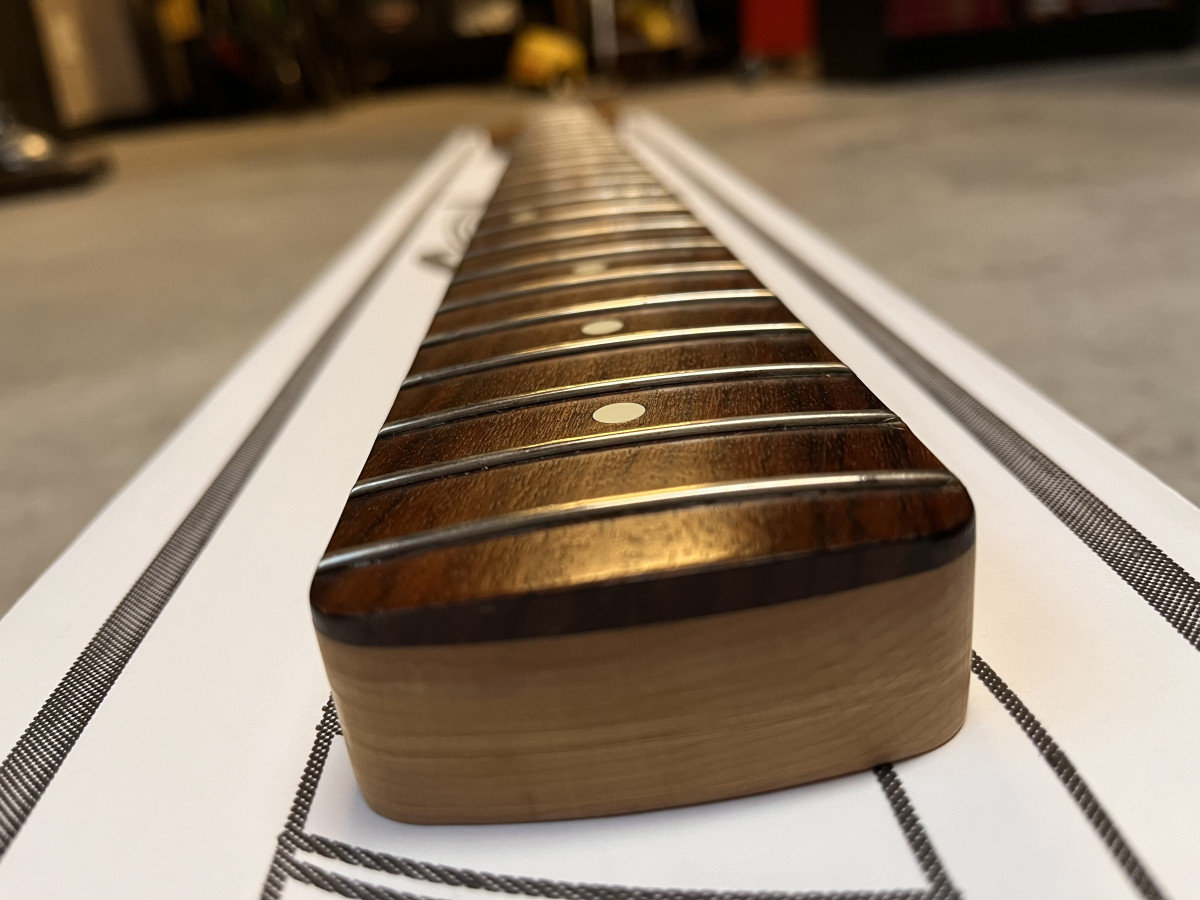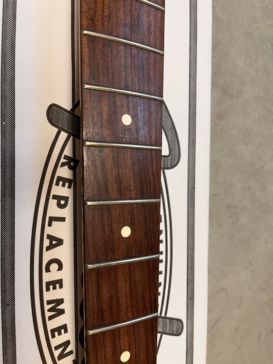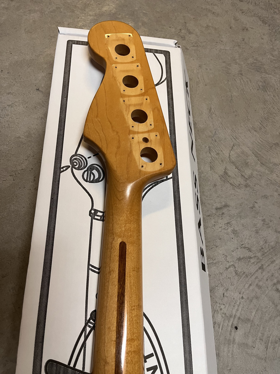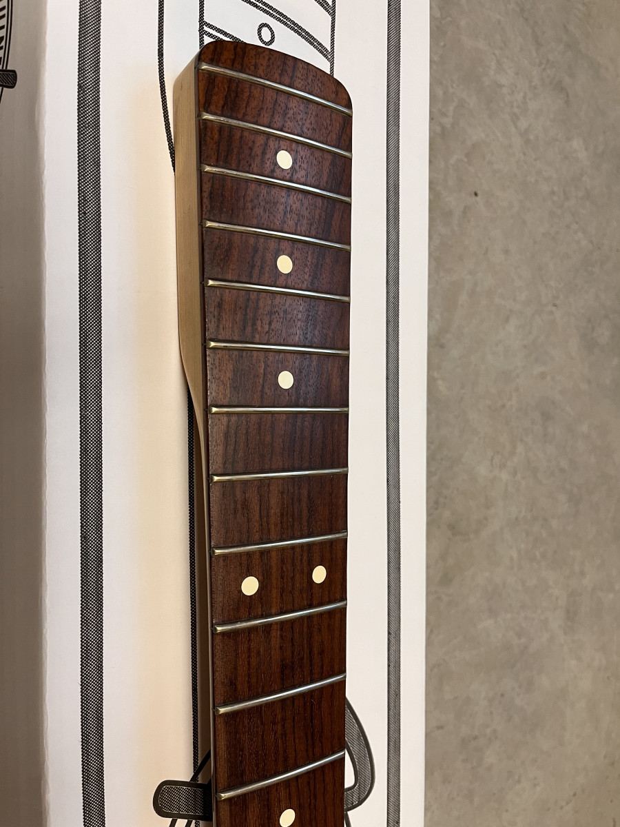 Mástil de Fender Jazz Bass mejicano de 2001. Radio 9.5 y diapasón de palidandro. Trastes en perfecto estado. Bonito dibujo de la madera, tanto en el palisandro como en el arce de la parte trasera. Alma funciona perfecta en ambos sentidos. Lo vendo porque no me gustan los mástiles finos y le he puesto uno de Precison a mi Jazz.