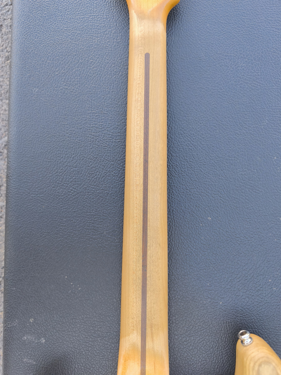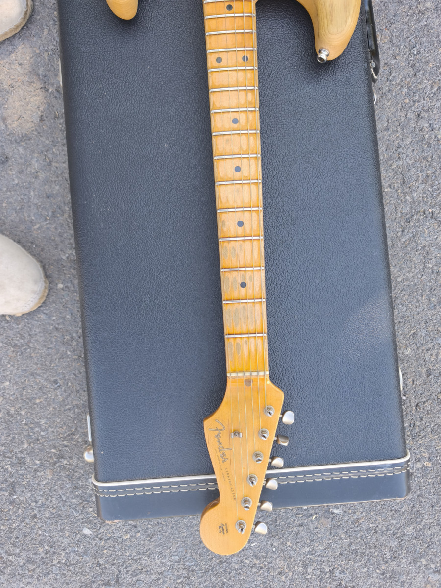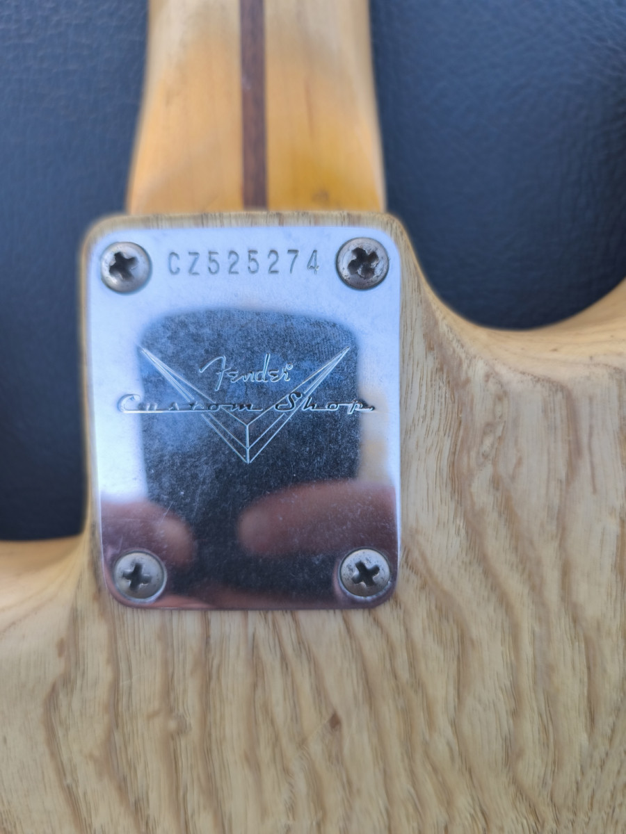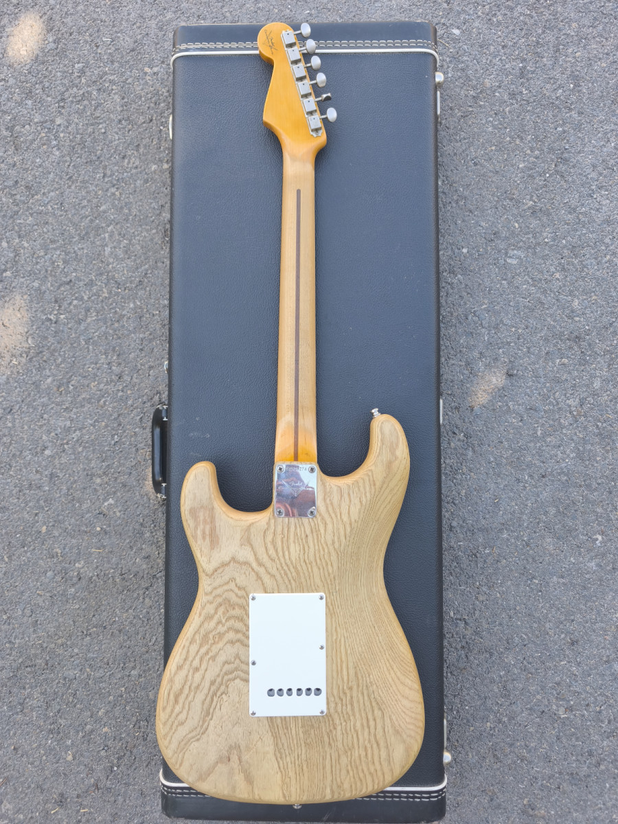 El mástil es de una Stratocaster Ancho Poblano que compré hace algún tiempo. Tengo toda la documentación de compra. El cuerpo original lo vendí en este mismo foro, porque prefería el fresno al aliso. Está impecable, trastes incluidos. El blackplate, puente, golpeador y botones son también de la ancho Poblano. Los potenciómetros y Jack no lo recuerdo. El cuerpo es de fresno All Parts de dos piezas sin tratar. Pastilla de mástil custom shop 69, pastilla de puente Texas special (creo recordar). No tiene pastilla central.