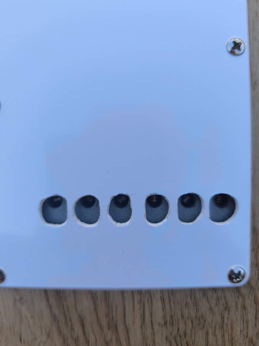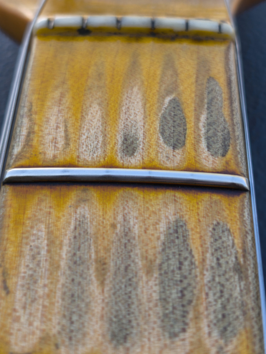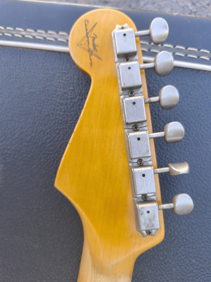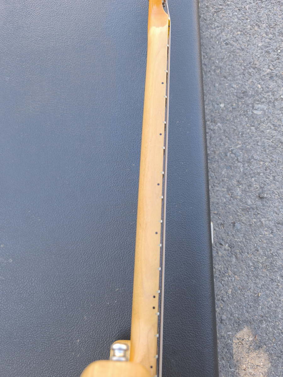 El mástil es de una Stratocaster Ancho Poblano que compré hace algún tiempo. Tengo toda la documentación de compra. El cuerpo original lo vendí en este mismo foro, porque prefería el fresno al aliso. Está impecable, trastes incluidos. El blackplate, puente, golpeador y botones son también de la ancho Poblano. Los potenciómetros y Jack no lo recuerdo. El cuerpo es de fresno All Parts de dos piezas sin tratar. Pastilla de mástil custom shop 69, pastilla de puente Texas special (creo recordar). No tiene pastilla central.