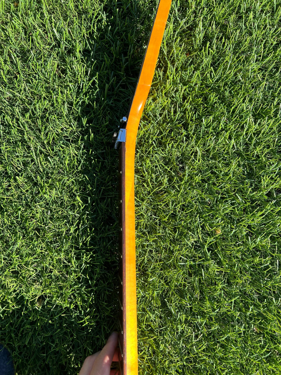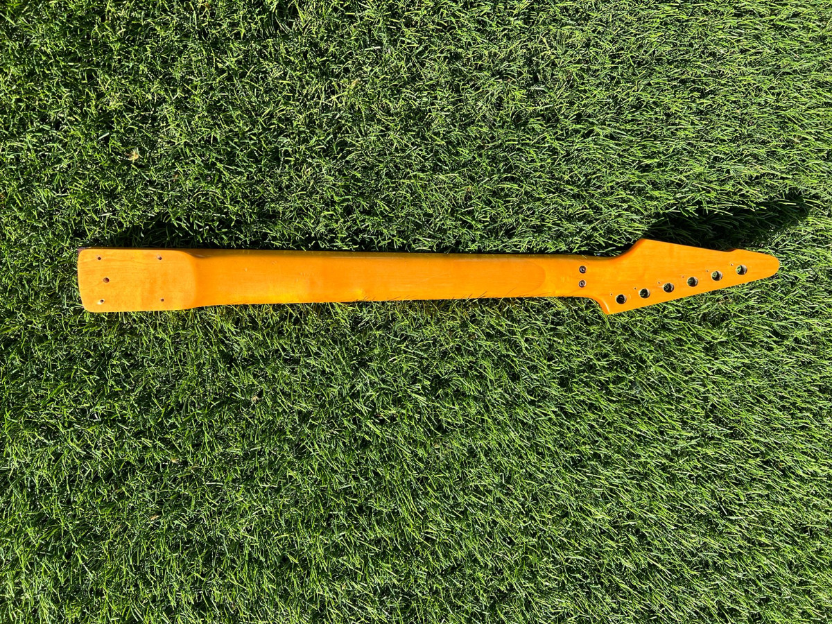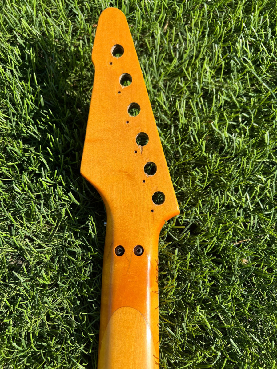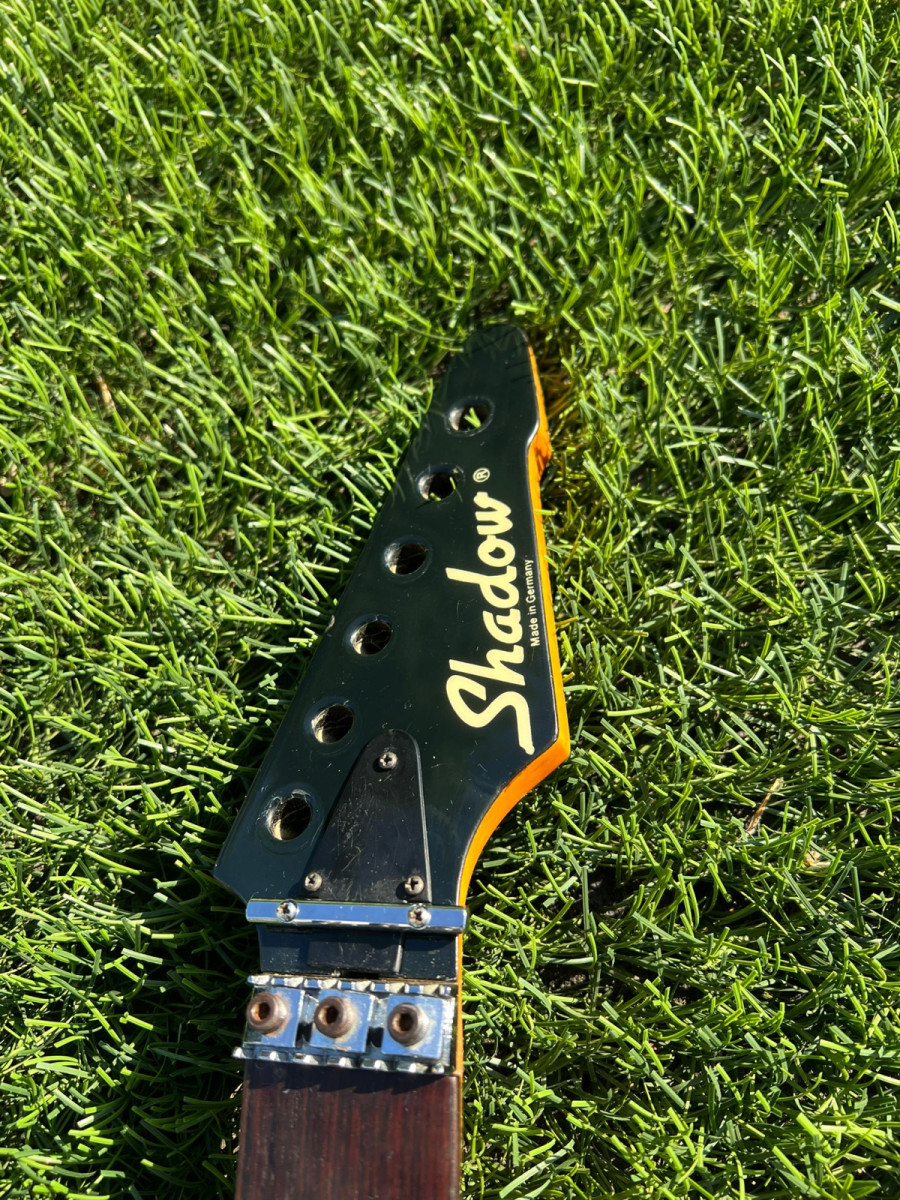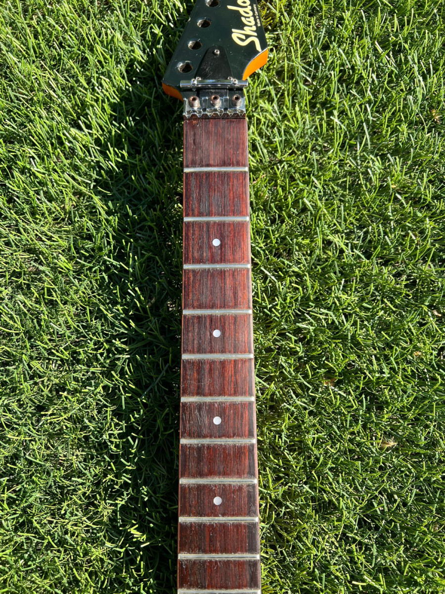 Mastil sacado de una shadow s100 alemana. Es de arce con diapasón de palorosa, 22 trastes jumbo. Tiene marcas y grietas que no han ido a más. El diapasón se despegó ligeramente cerca de la cejuela pero fue reparado, de ahí el precio. El alma funciona perfectamente y no presenta trasteos.